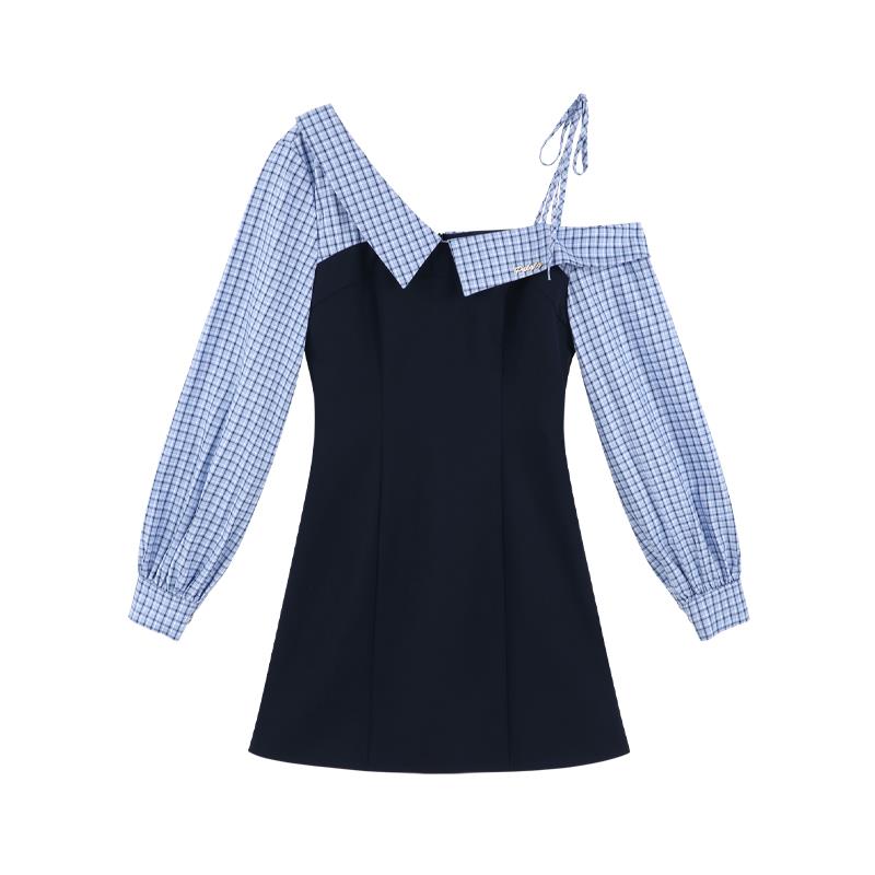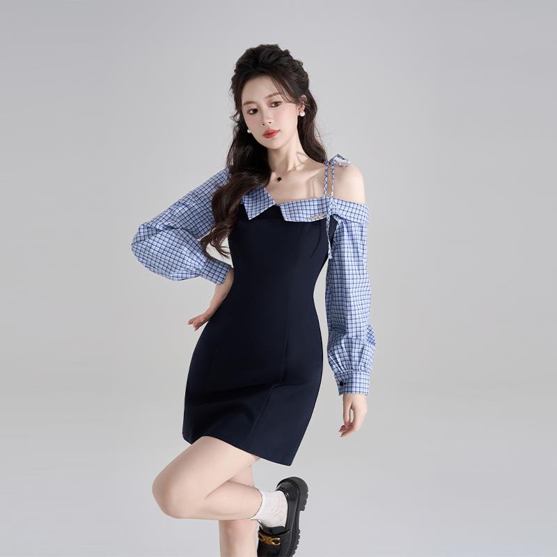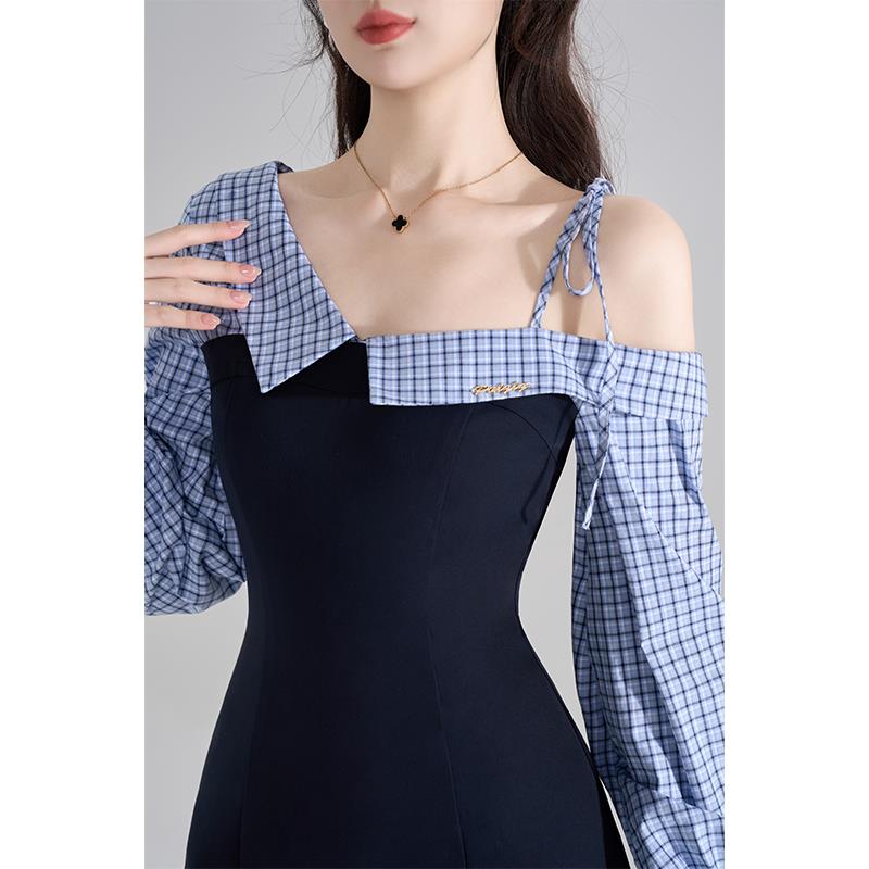 高级感拼接格子衬衫露肩连衣裙女春季收腰气质法式a字蓝色短裙子