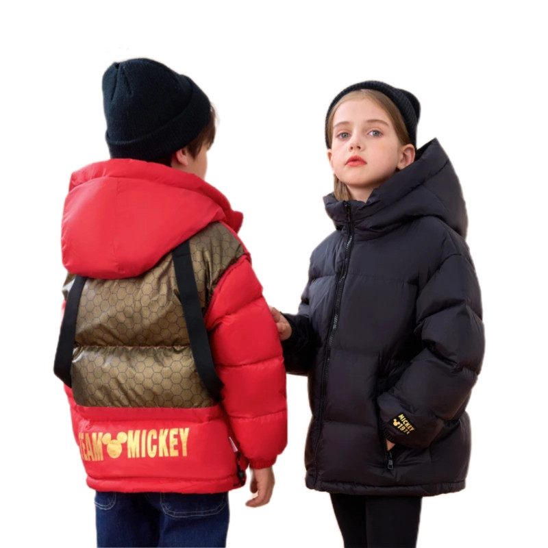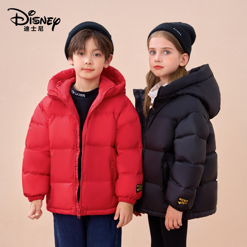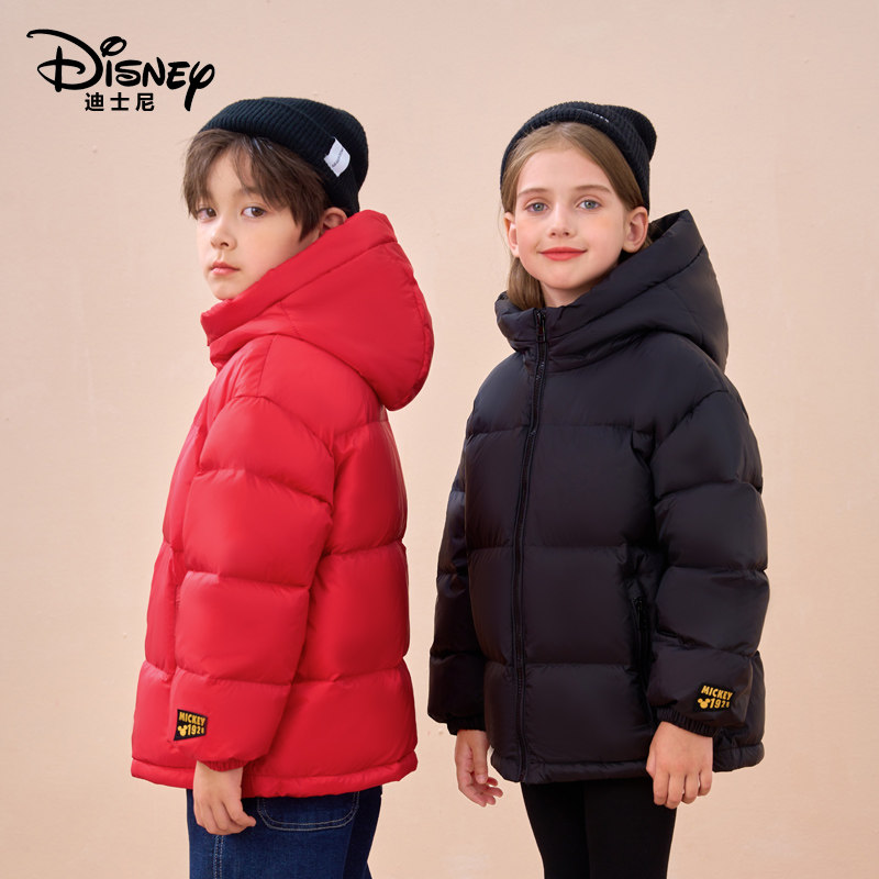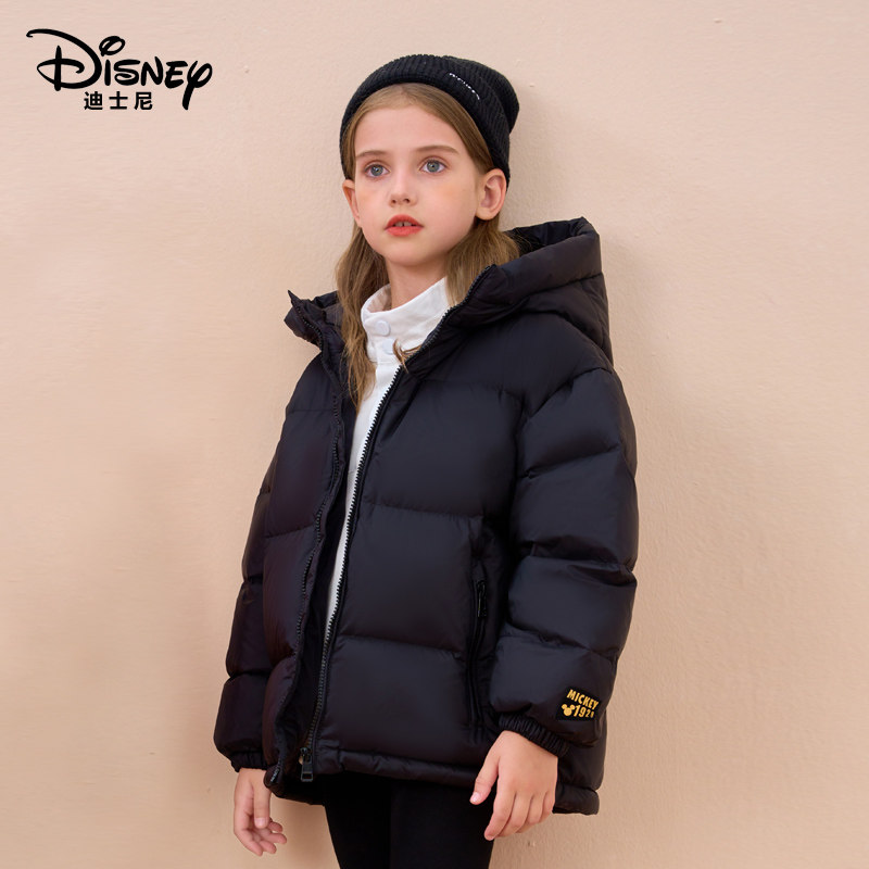 新品迪士尼儿童羽绒服黑金中长款加厚外套男童女童连帽冬装面包服