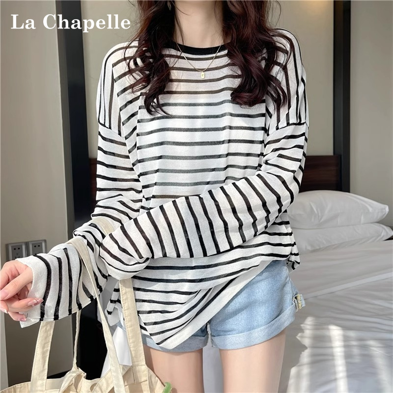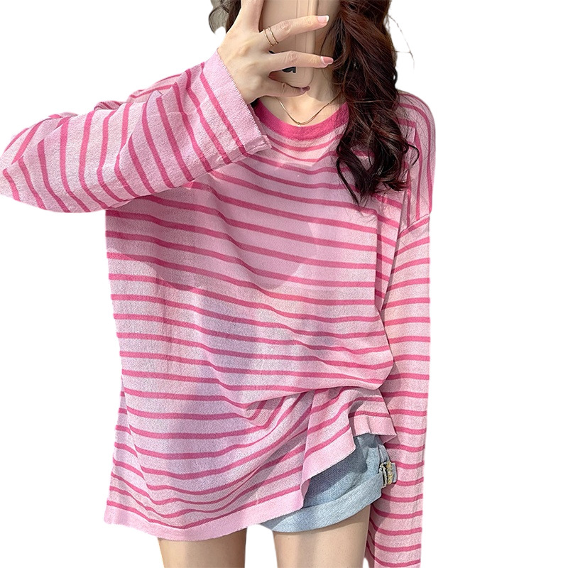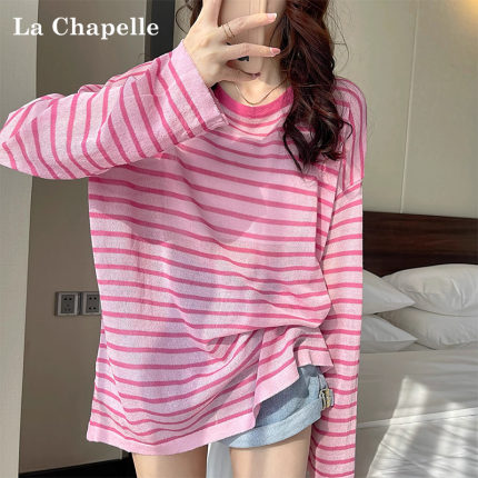 拉夏贝尔粉色圆领条纹冰丝长袖T恤女夏季薄款宽松针织罩衫上衣