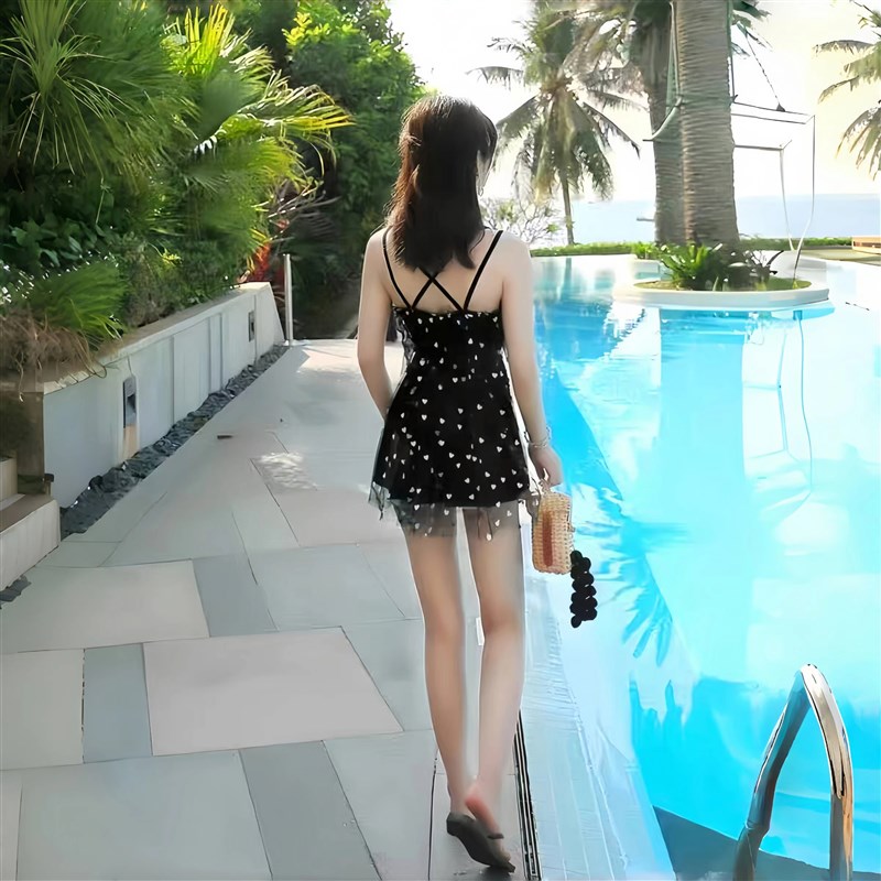 分体泳衣女性感显瘦遮肚ins黑色清新网纱保守小胸聚拢温泉游泳衣