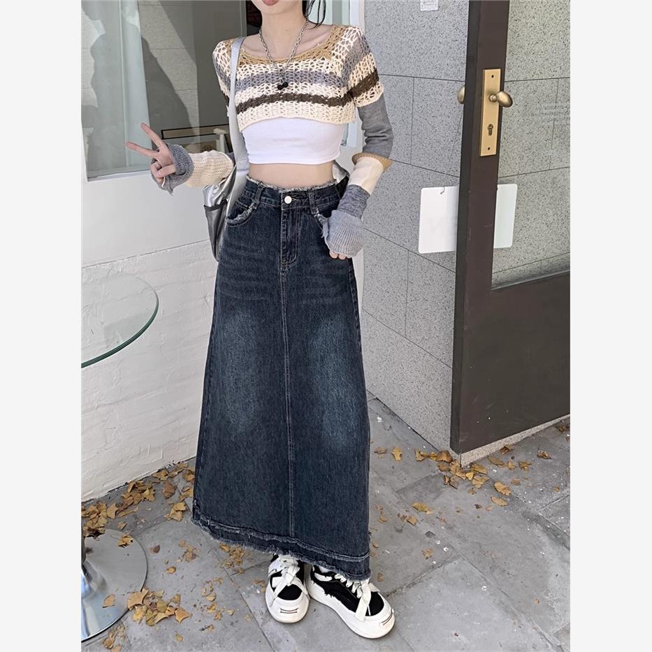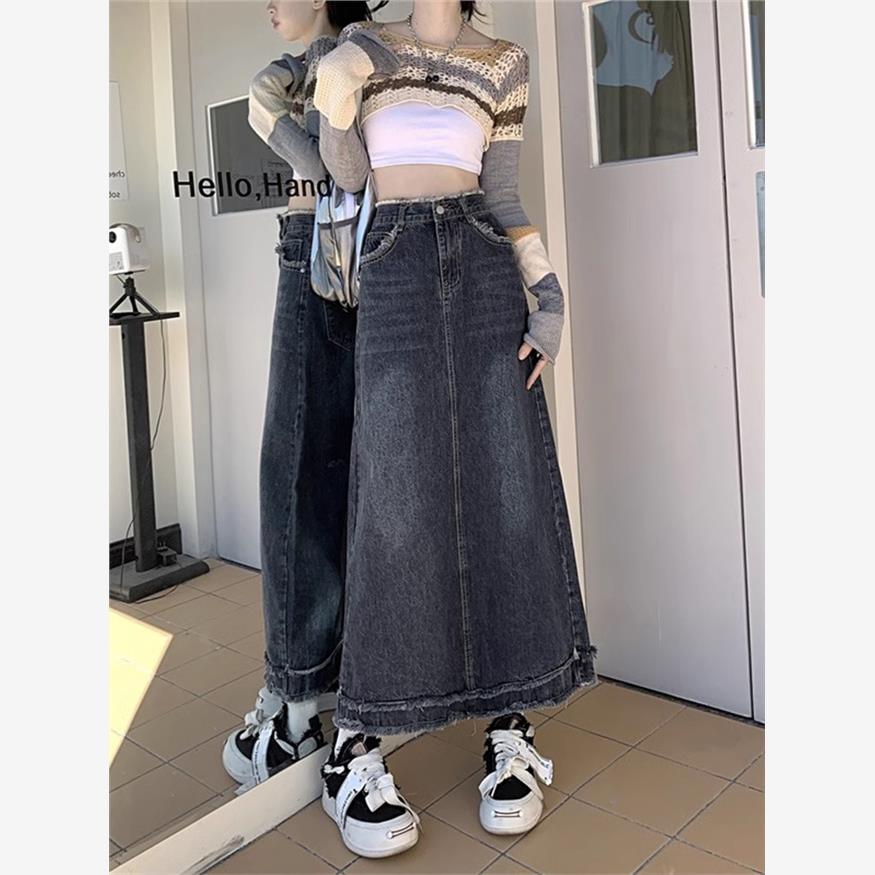 胖mm特大码女装毛边覆古牛仔半身裙女春秋裙子高腰显瘦a字中长裙