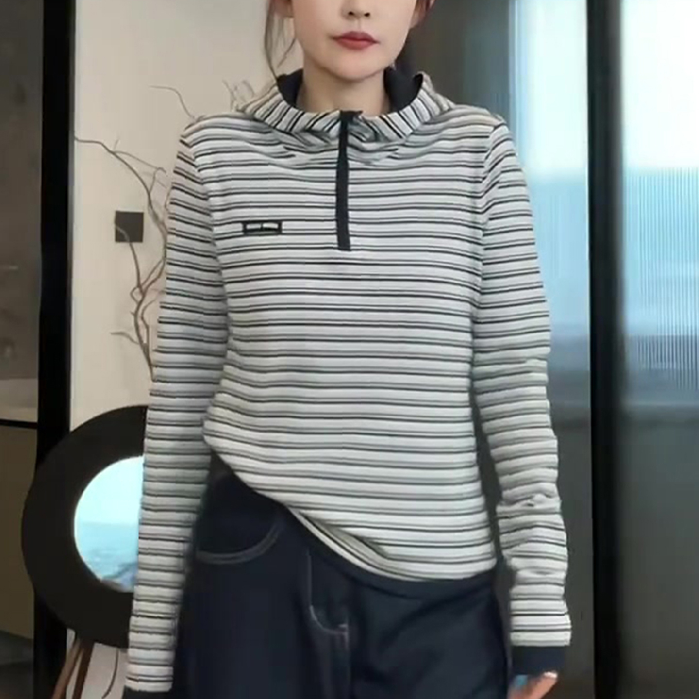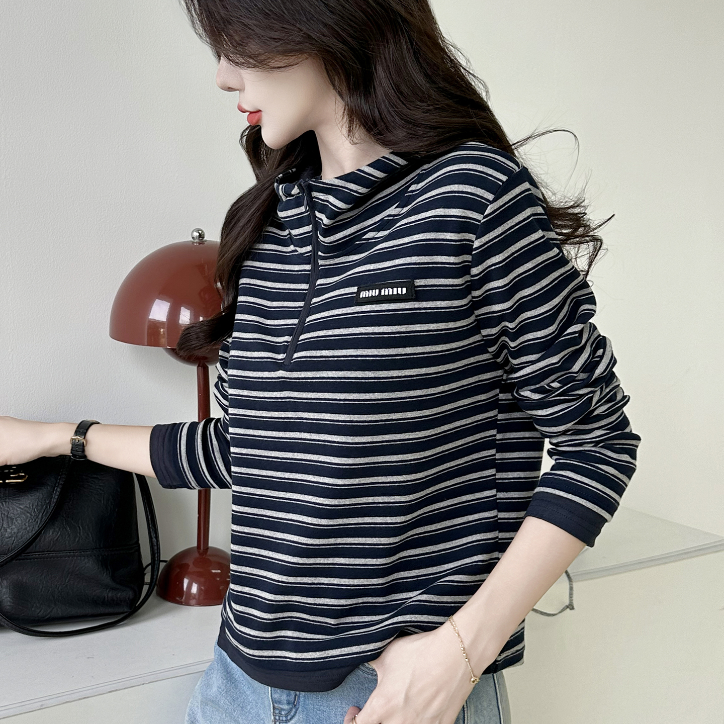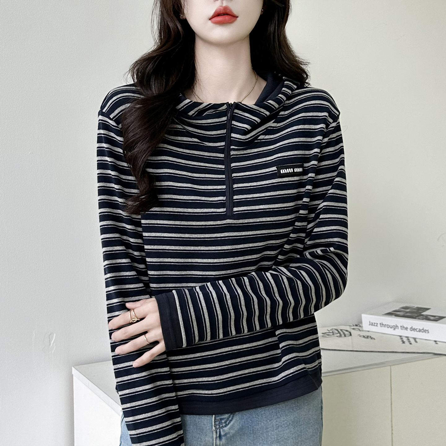 2025秋冬新款条纹连帽卫衣长袖t恤女纯棉带帽衫打底减龄上衣外穿