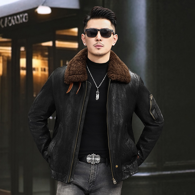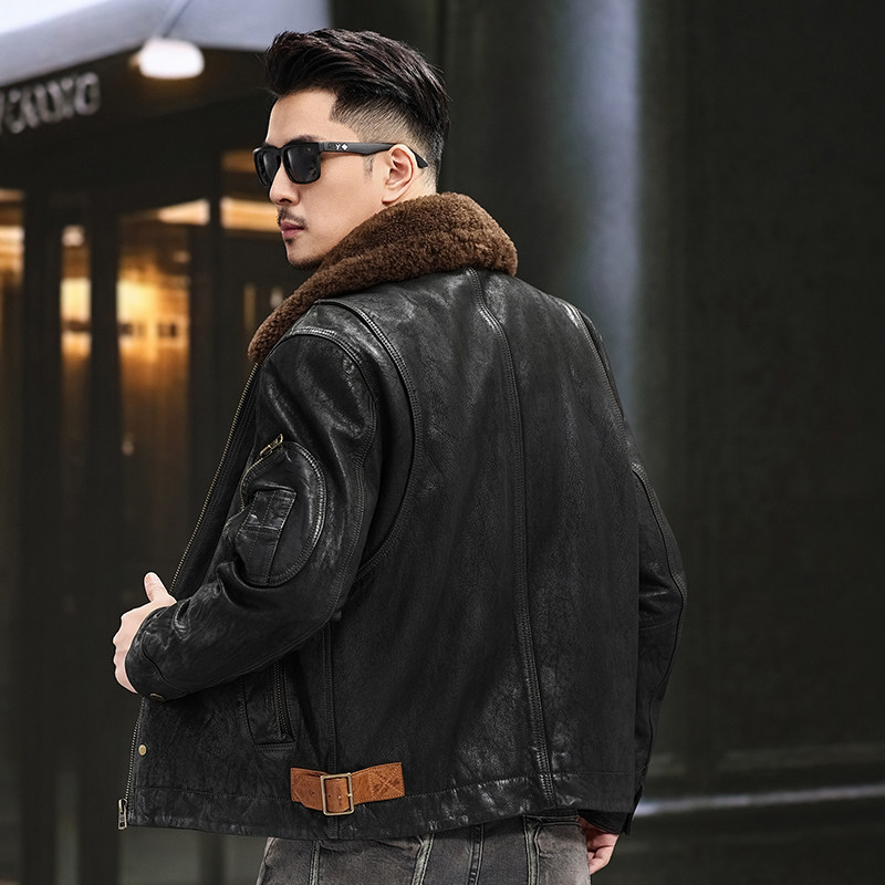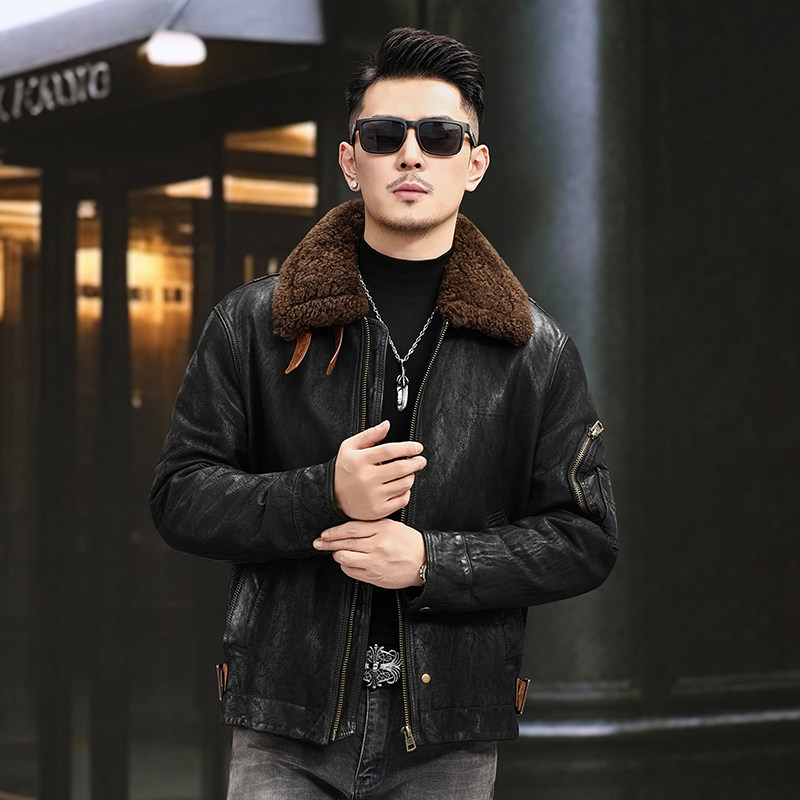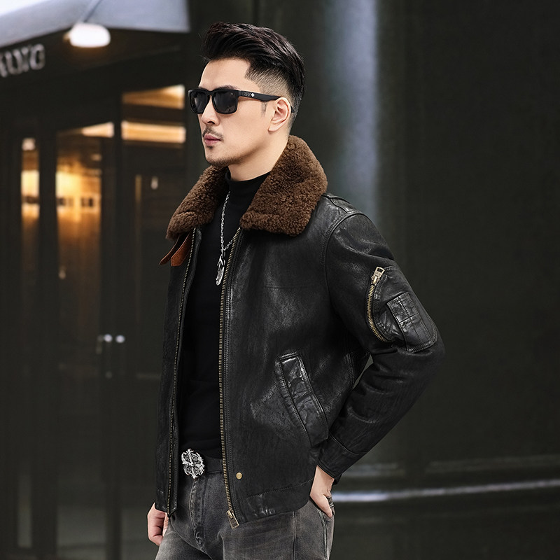 2025美式空军飞行真皮皮衣加绒加棉山羊皮外套潮男毛领机车皮夹克