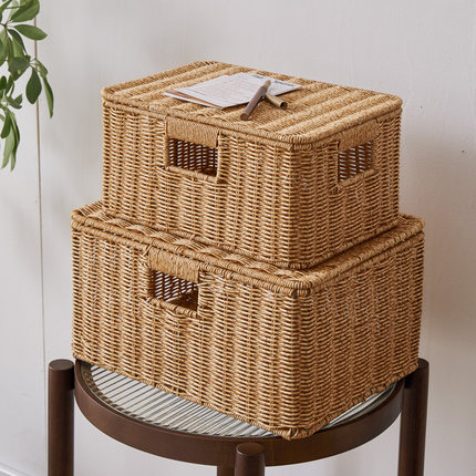 仿藤编带盖桌面零食收纳盒编织收纳筐整理储物收纳箱翻盖收纳篮
