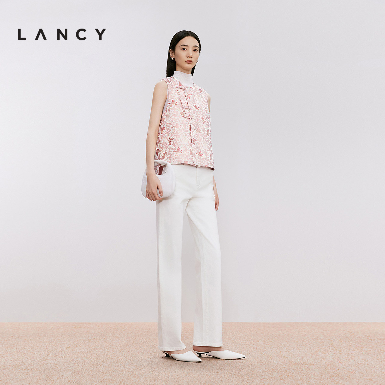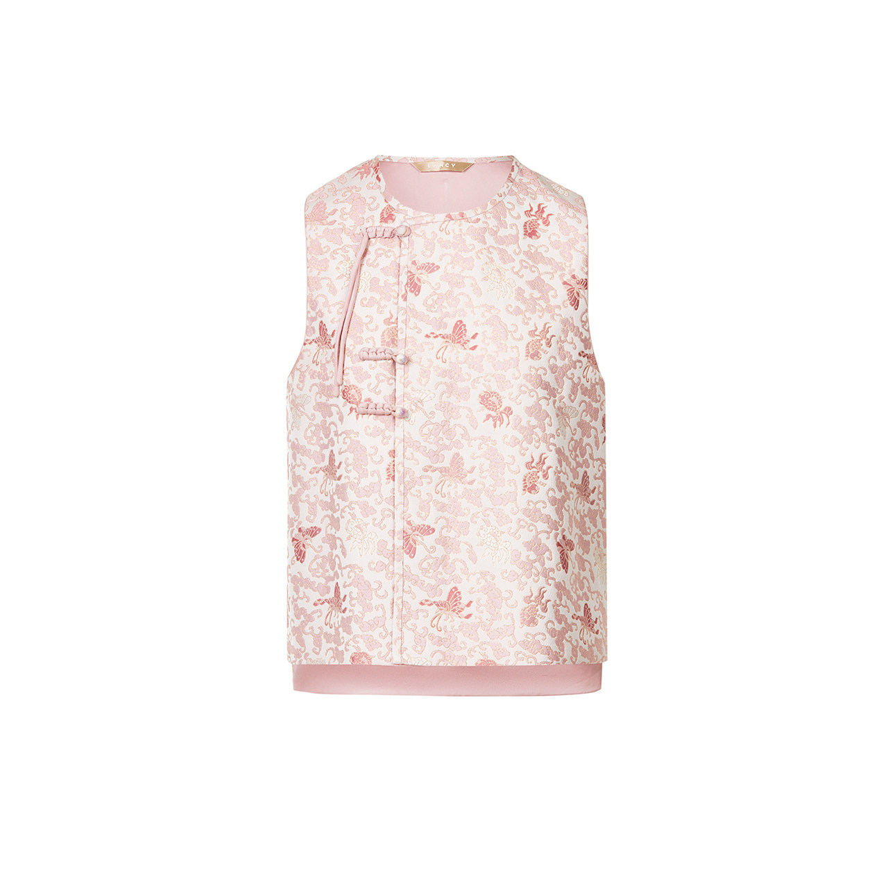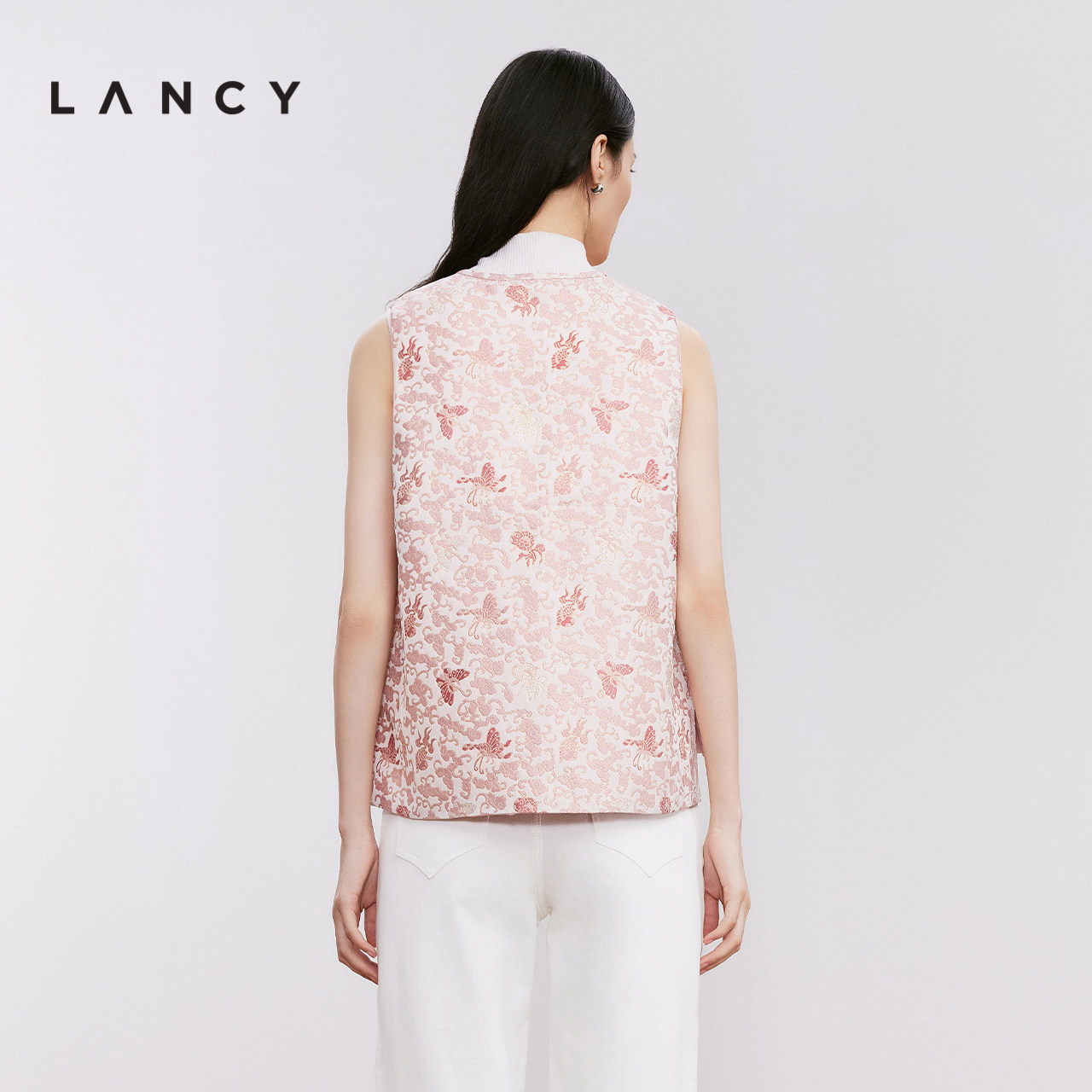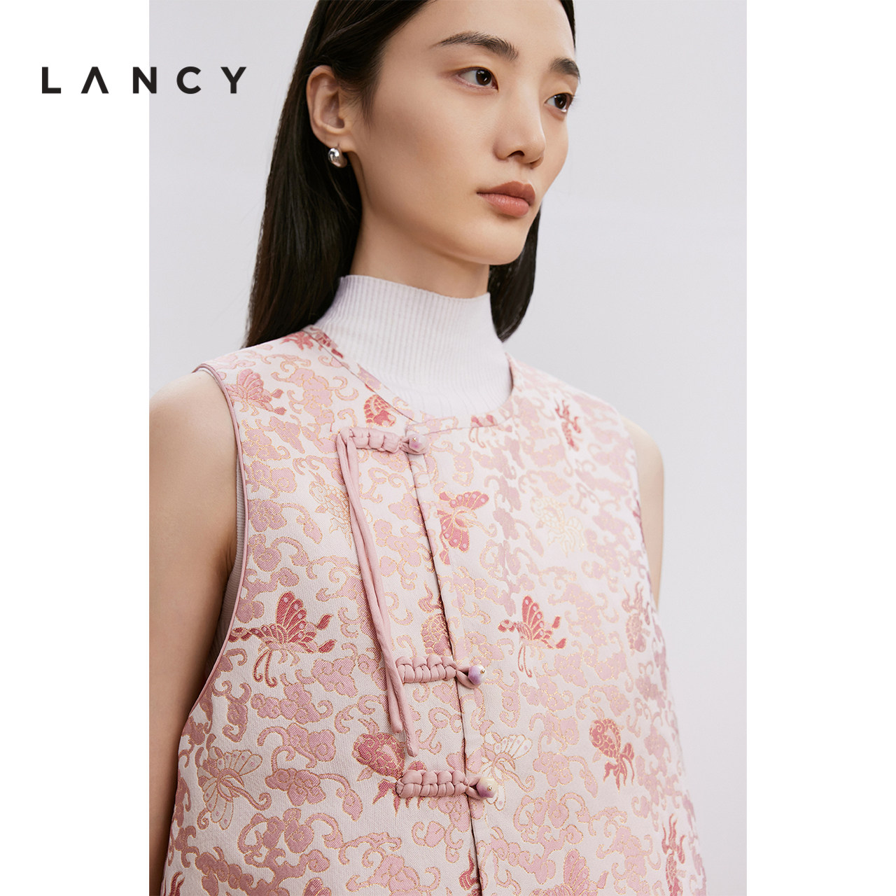 LANCY/朗姿2024年冬新款高级提花中式宋锦马甲女粉色圆领气质上衣