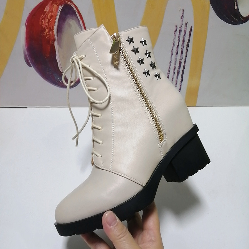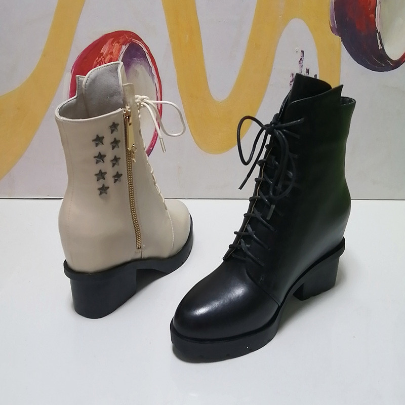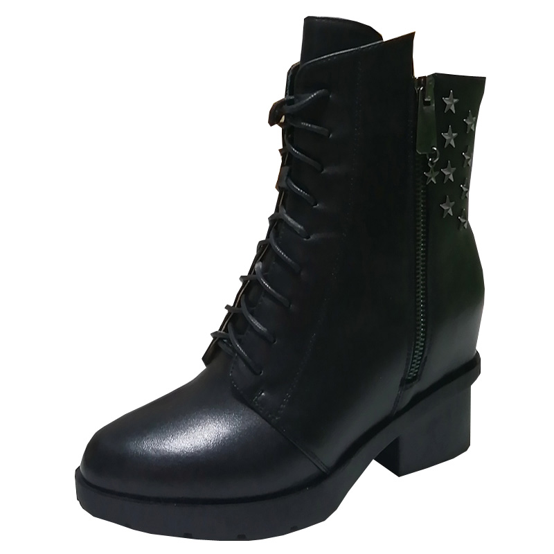 葆尔力正品侧拉链马丁靴女真皮系带粗跟内增高春秋潮短靴断码清仓