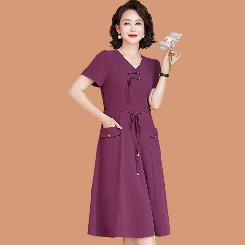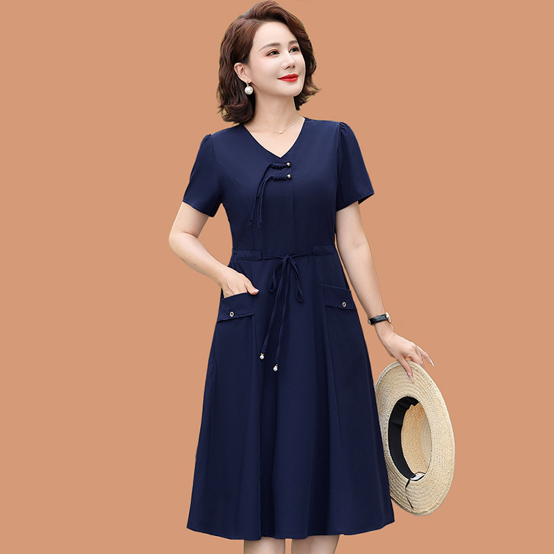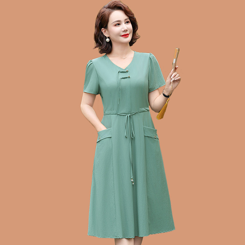 妈妈夏装新中式连衣裙新款中老年女装夏季中长款收腰显瘦纯色裙子