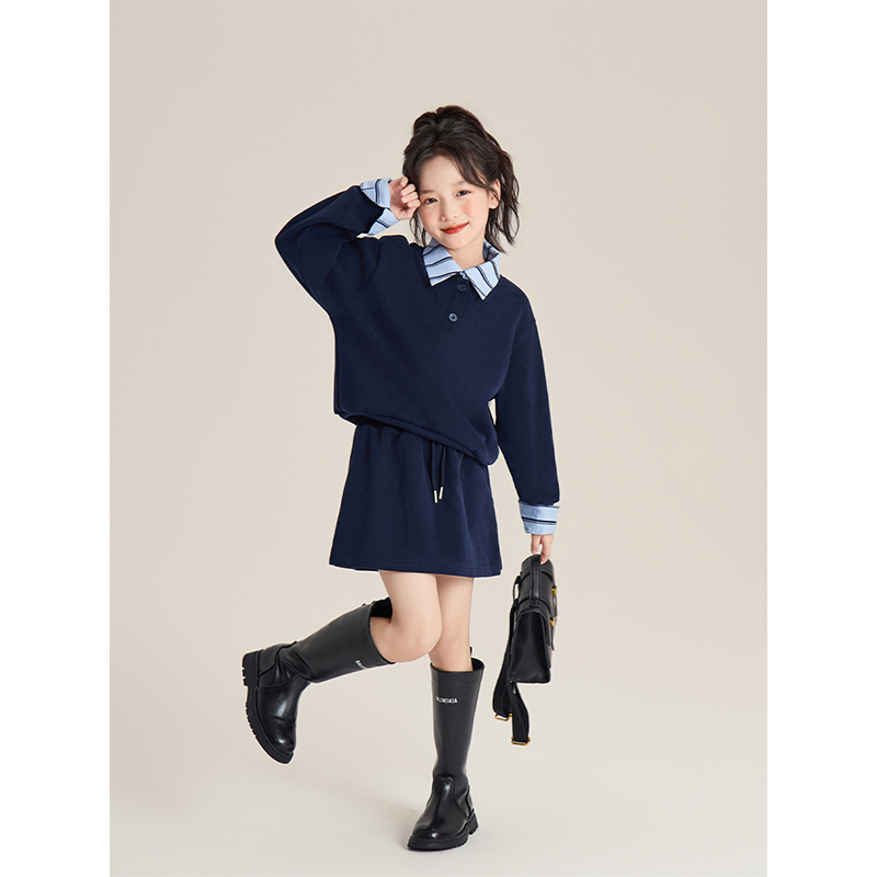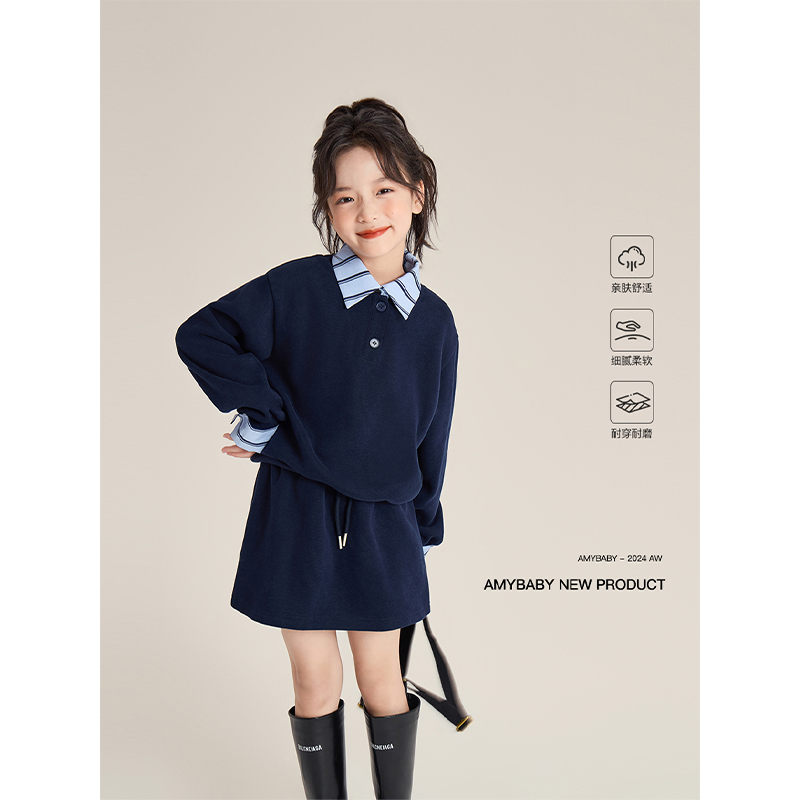 Amybaby女童套装冬季2025新款假两件衬衫拼接设计感长袖上衣A字裙