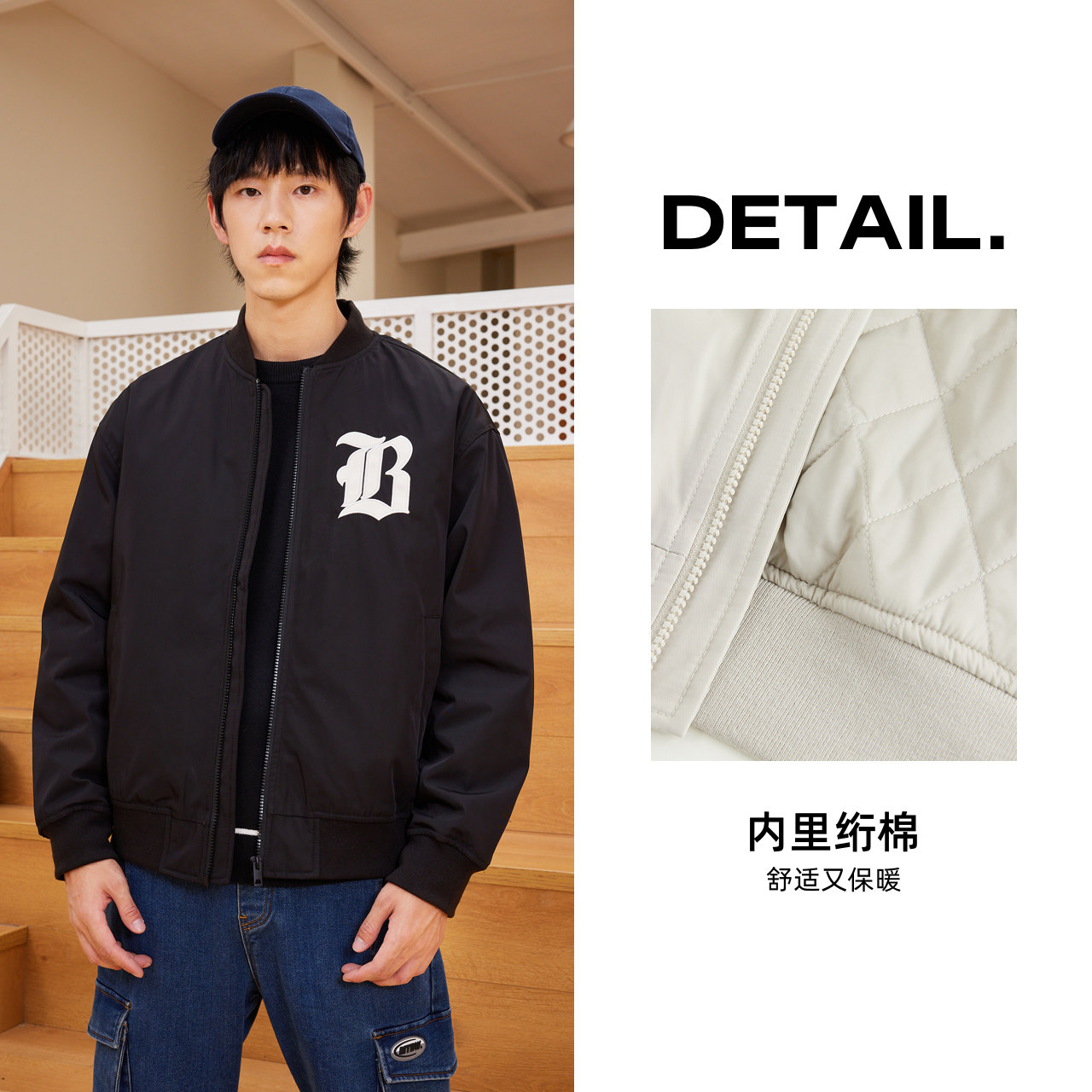 美特斯邦威绣花棒球衫男2024冬季新款潮棉衣舒适外套保暖夹克上衣