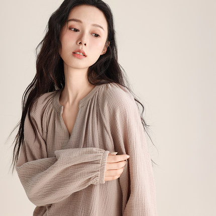 春夏女士双层纱睡衣薄V领套头简约优雅宽松全棉可外穿家居服套装