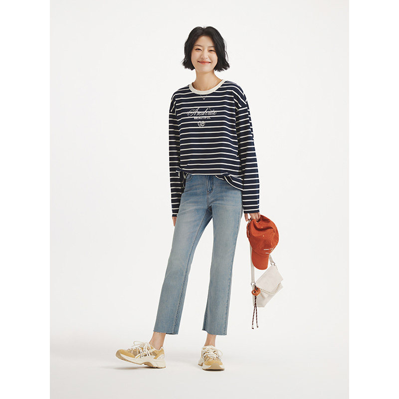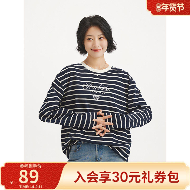热风2025年秋季新款女士字母条纹长T圆领长T恤宽松休闲自然垂感