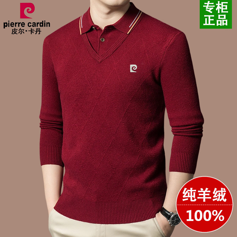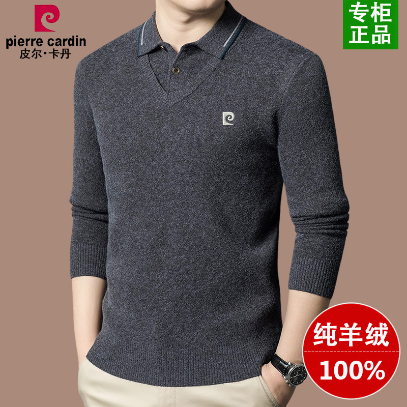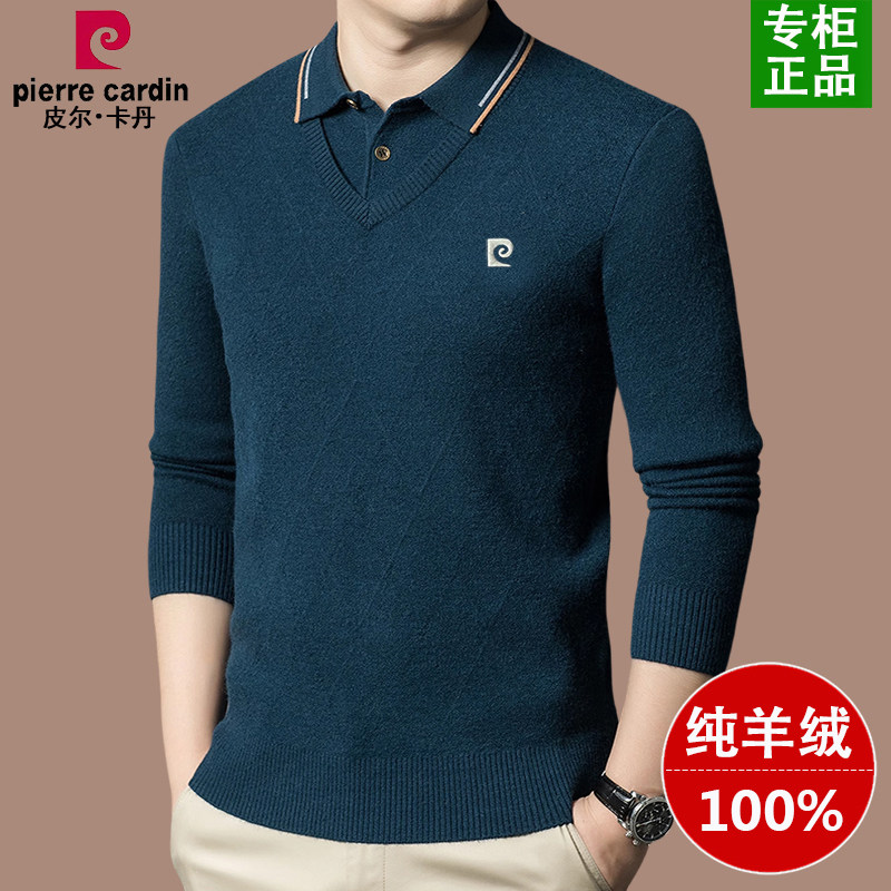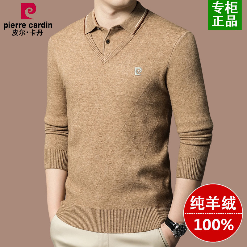 皮尔卡丹100%纯羊绒衫男士假两件毛衣冬季加厚衬衫领打底羊毛衫男