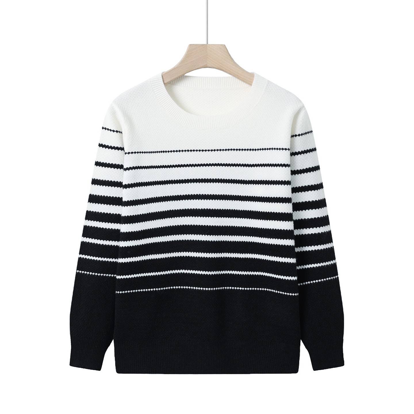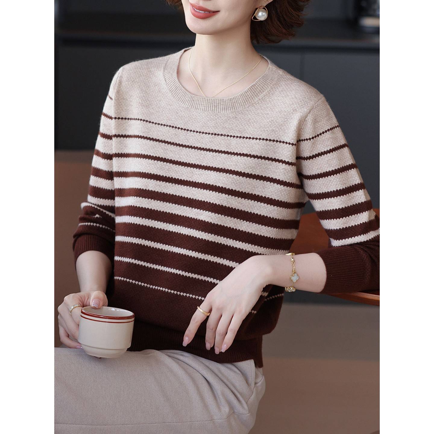 2025年春秋新款针织衫女士宽松遮肚子时尚圆领条纹毛衣打底衫上衣