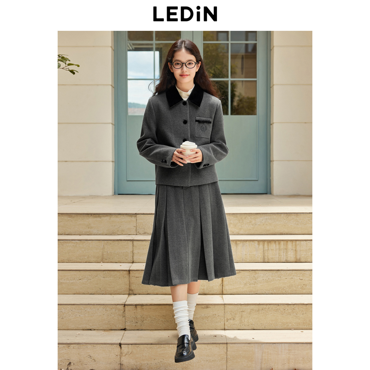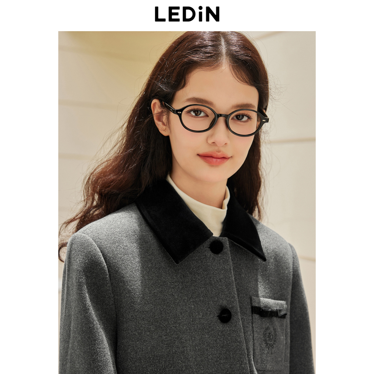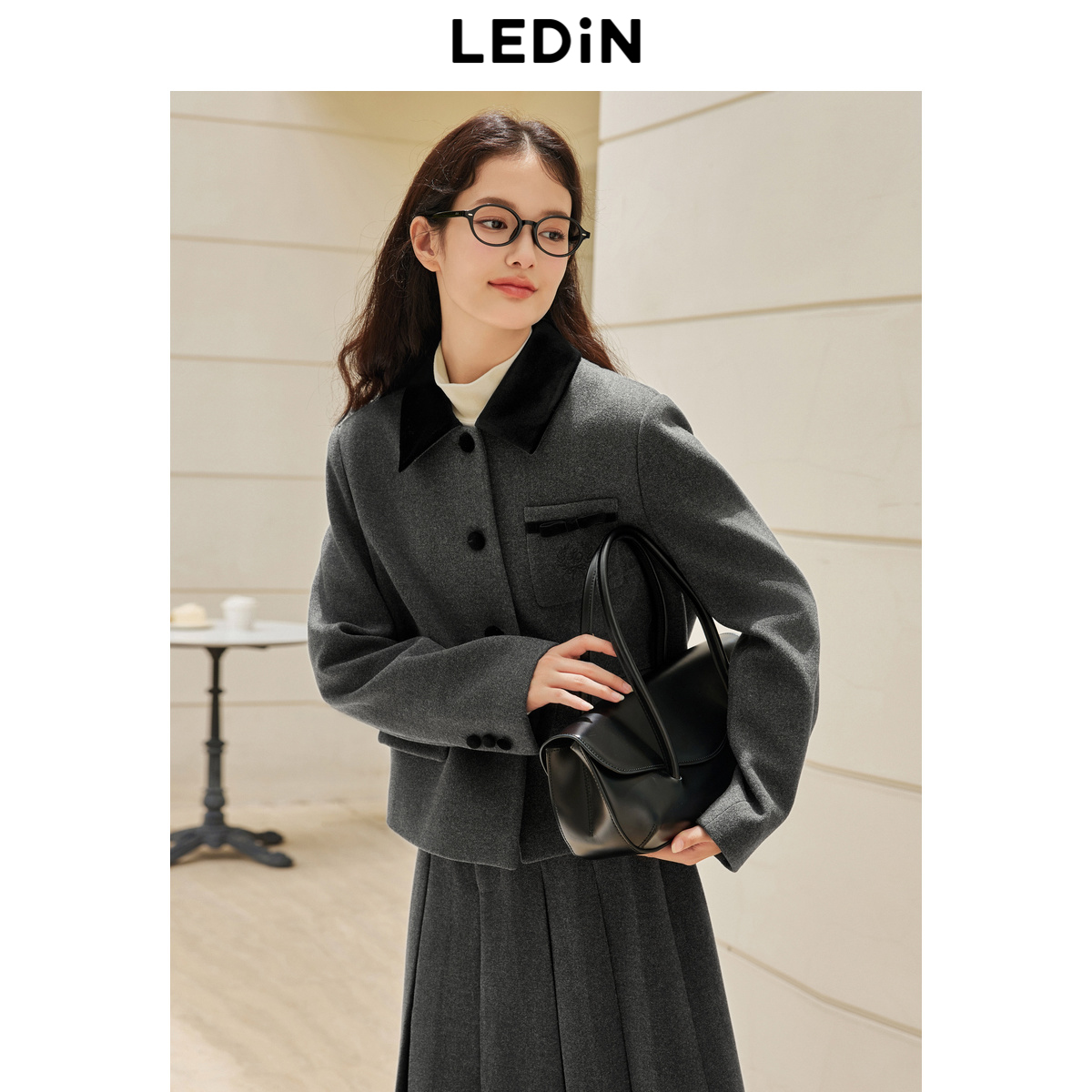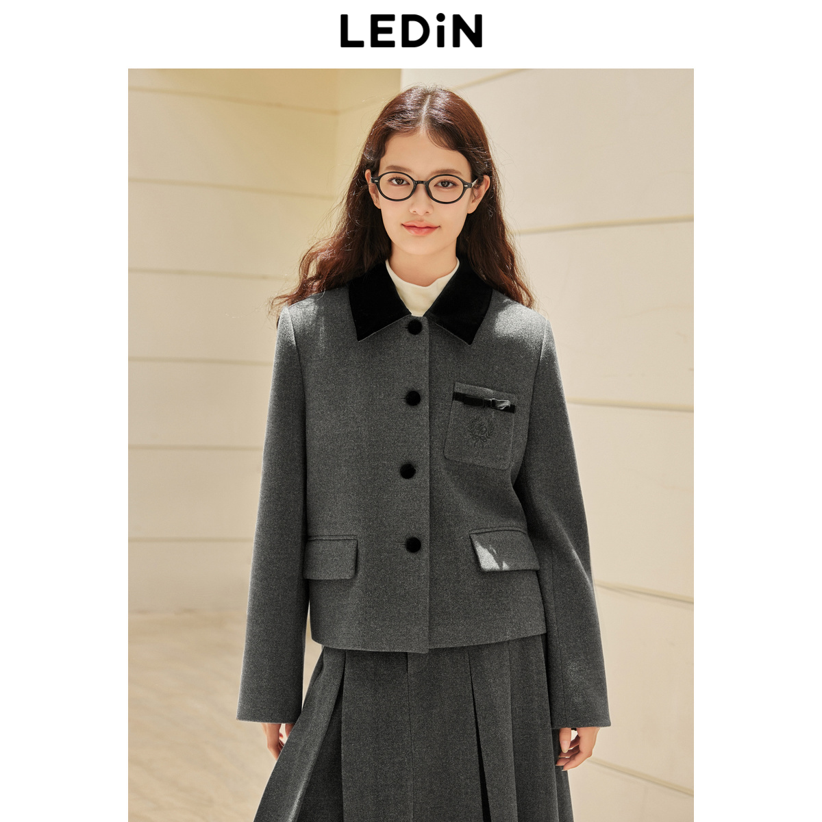 乐町学院少女领口撞色外套冬季新款口袋丝绒蝴蝶结设计上衣