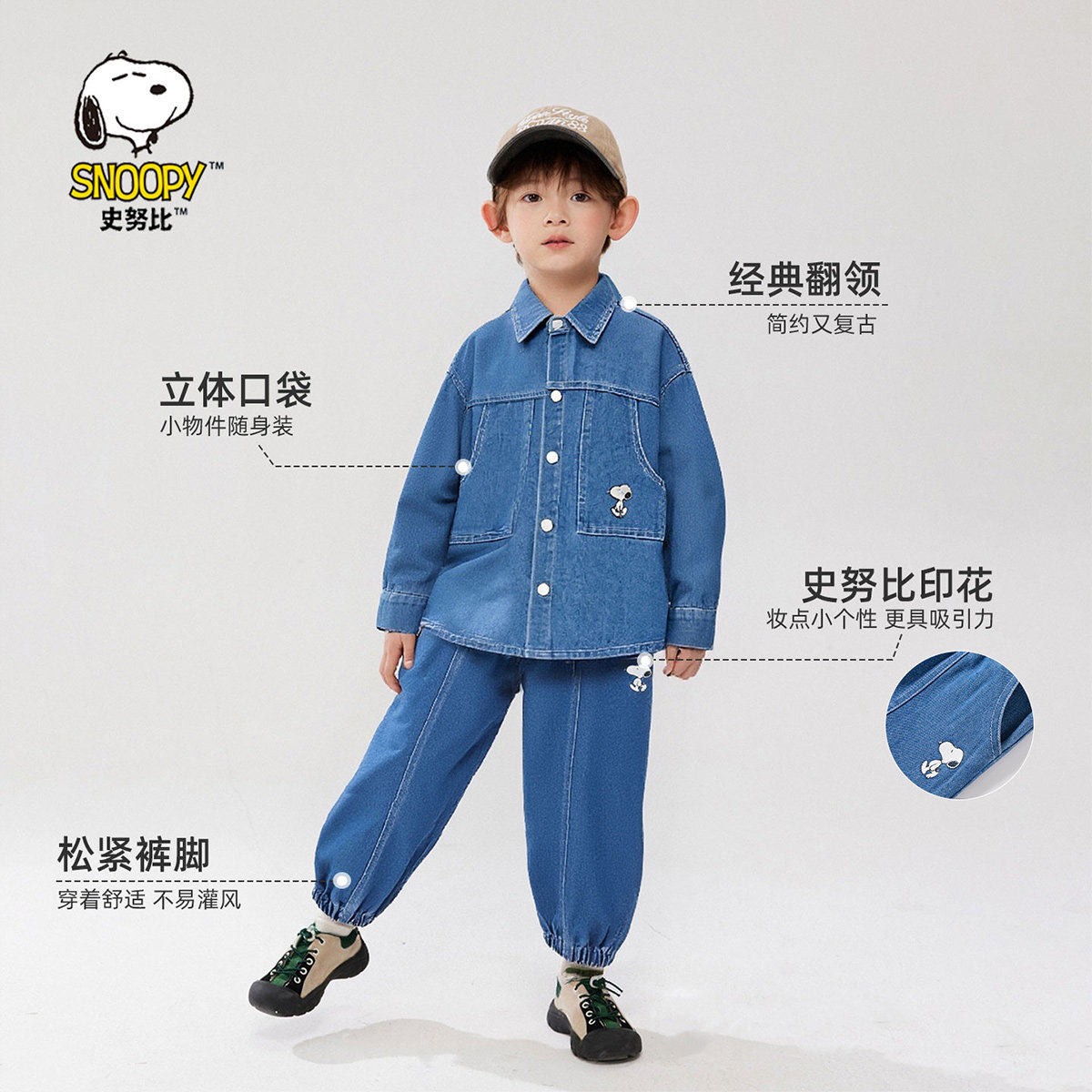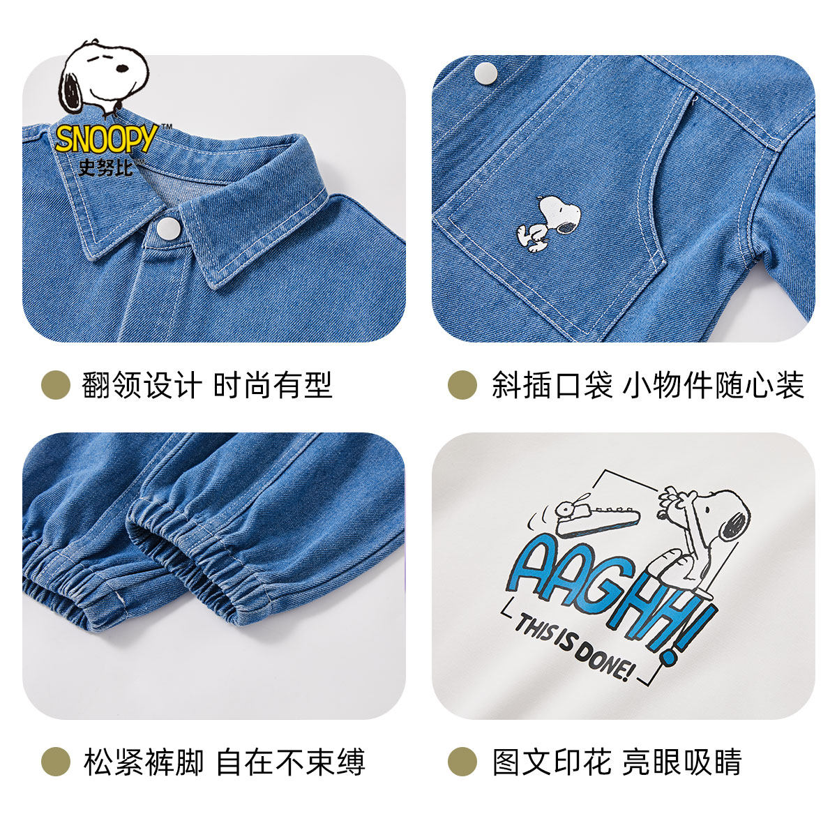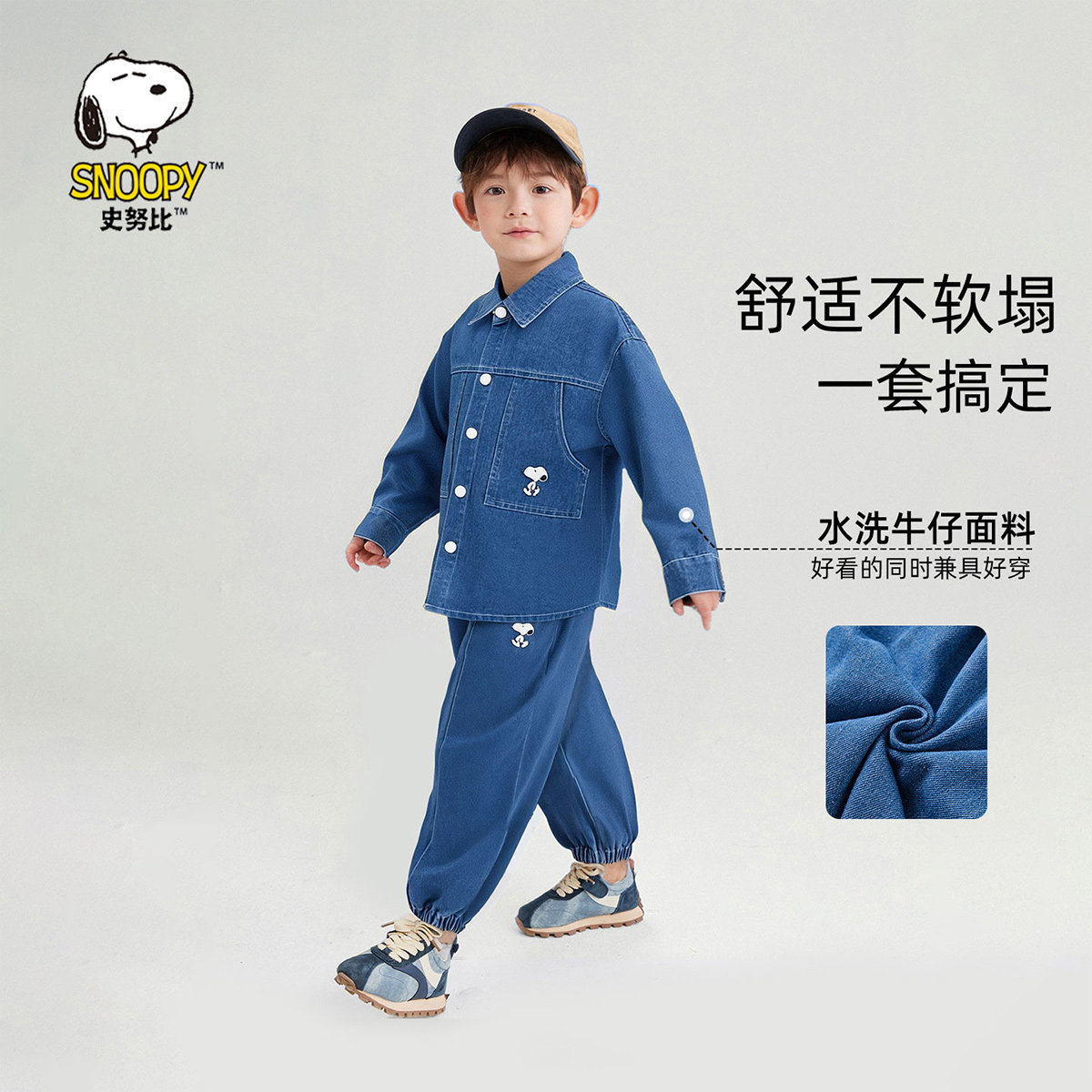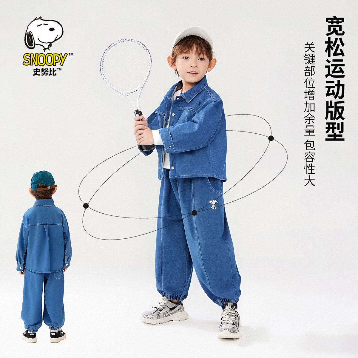史努比男童牛仔套装春秋2025新款儿童外套长袖T恤休闲裤子三件套
