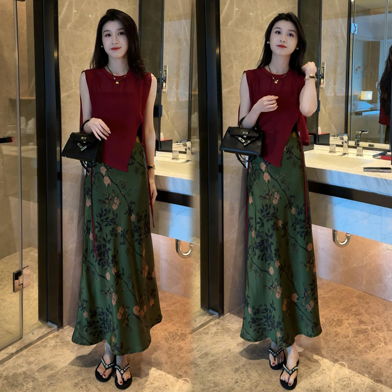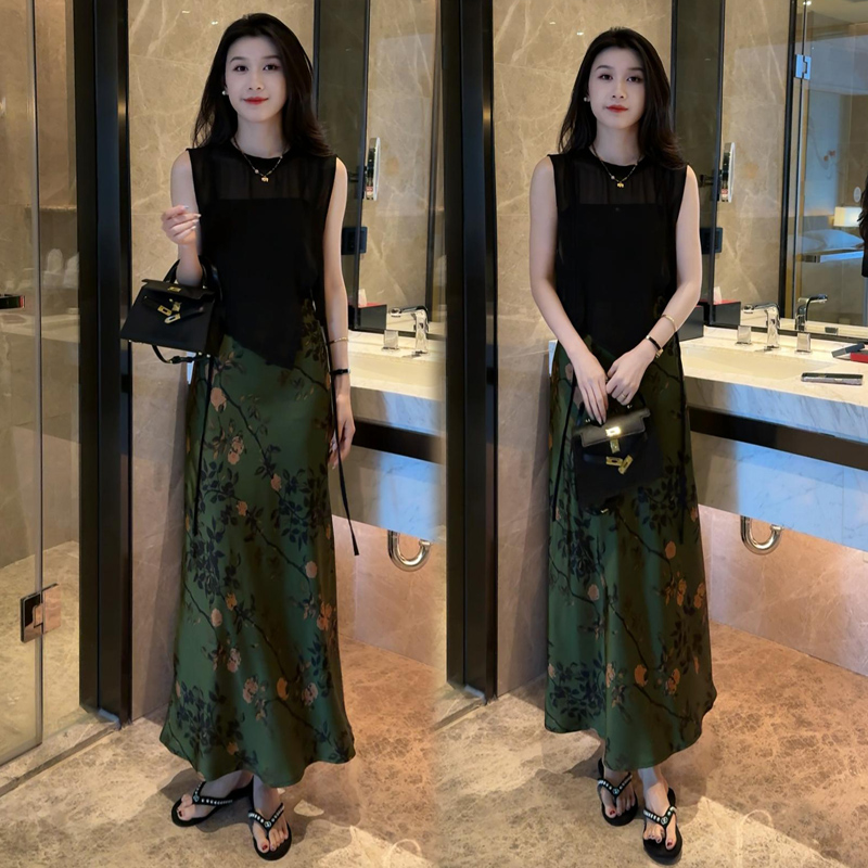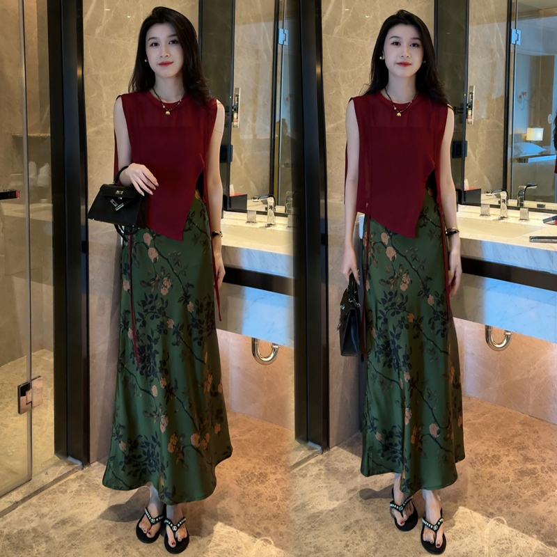 夏季新款时尚套装女洋气轻奢新中式显瘦无袖上衣印花半身裙两件套