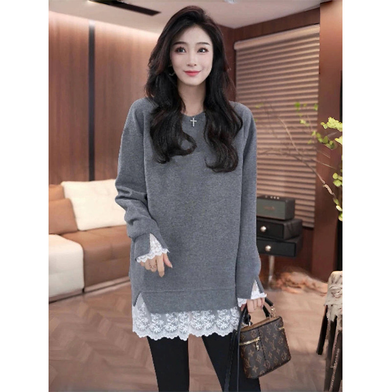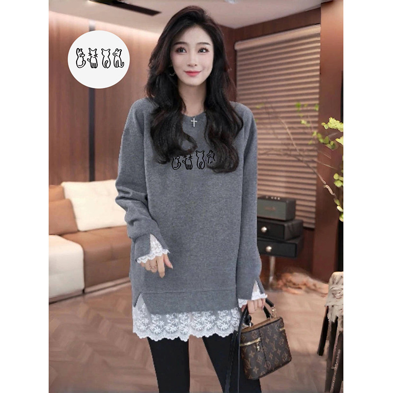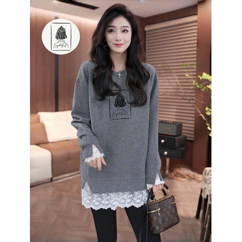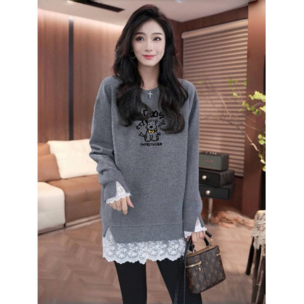 中长款拼接蕾丝磨毛德绒T恤女秋冬减龄卡通印花遮屁股打底衫上衣