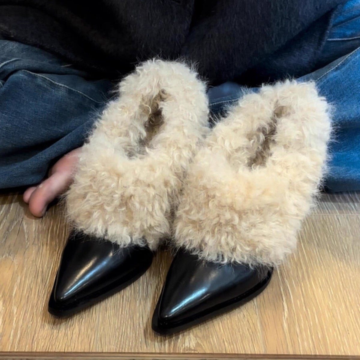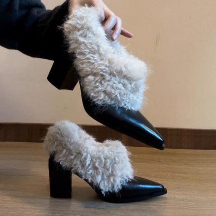 2025秋冬季新款尖头小皮鞋女复古一脚蹬毛毛单鞋高跟厚绒保暖棉鞋