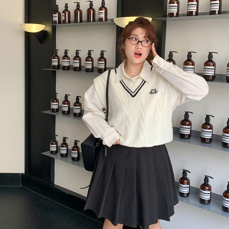 YUZI鱼子上衣V领韩系学院风马甲大码女装微胖mm显瘦遮肉印花马夹