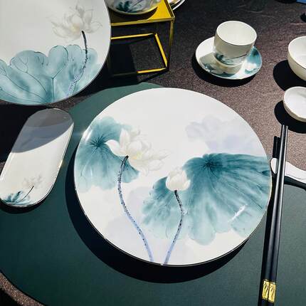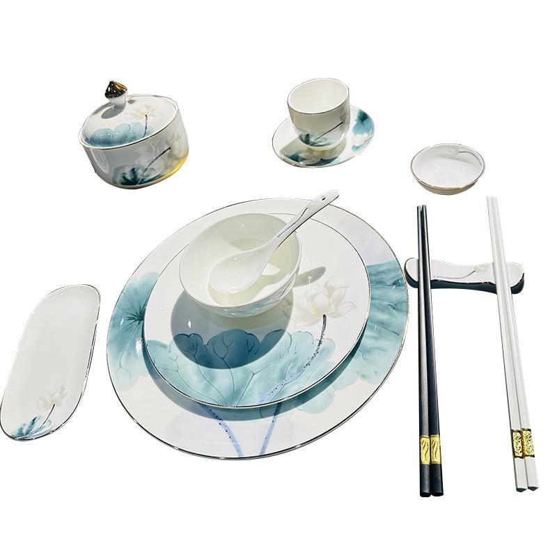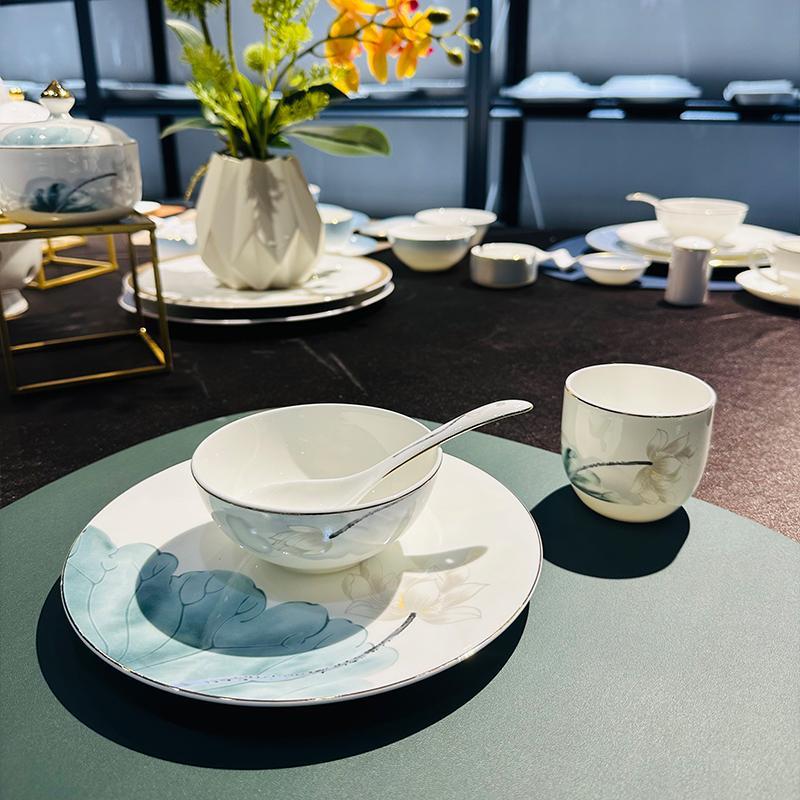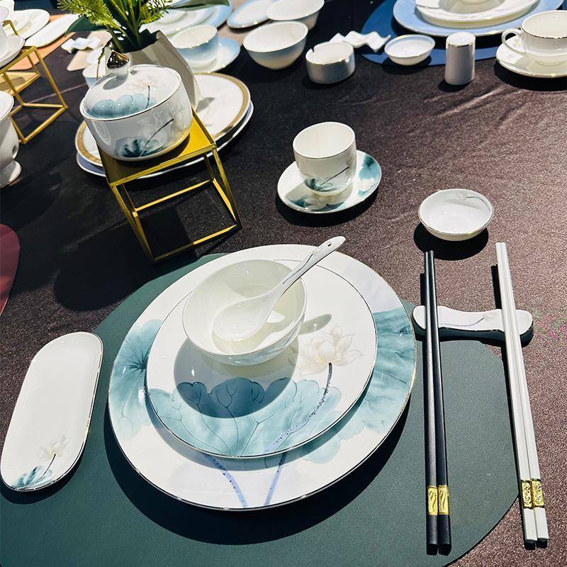 新中式青荷花金边高档酒店摆台餐具私人会所骨瓷碗碟套装logo定制