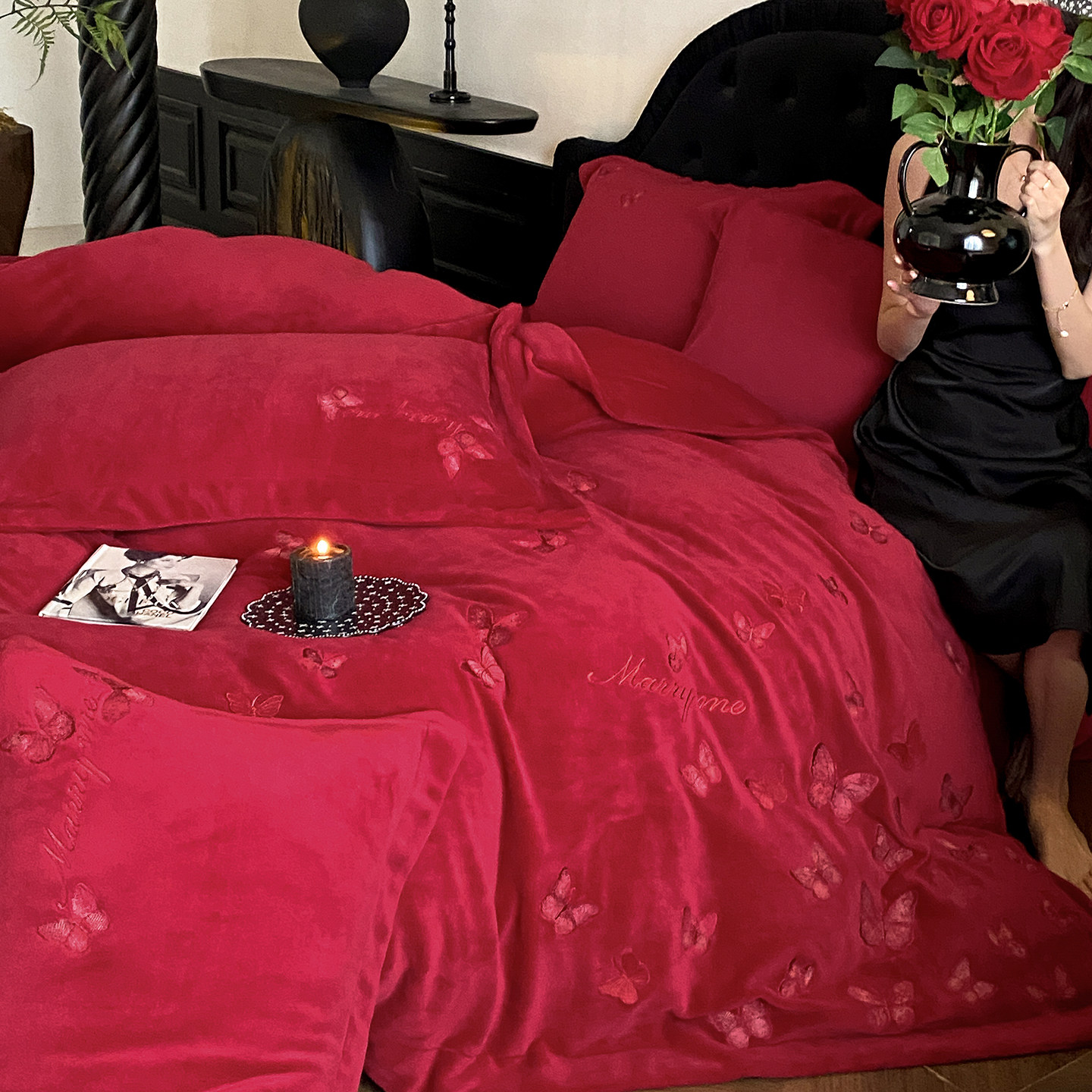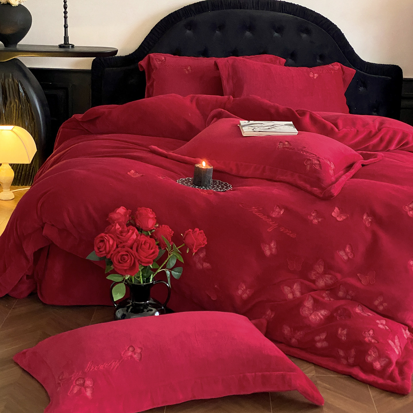 法式蝴蝶刺绣牛奶绒婚庆四件套红色秋冬季保暖珊瑚绒被套结婚床品