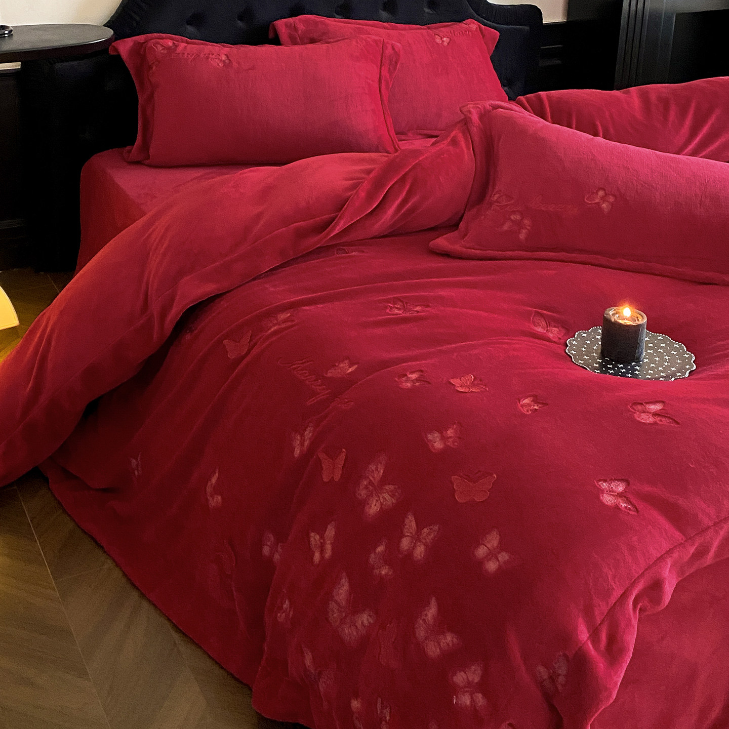 法式蝴蝶刺绣牛奶绒婚庆四件套
