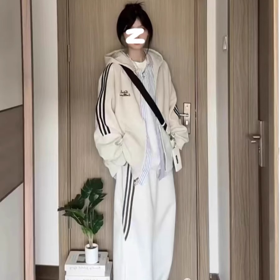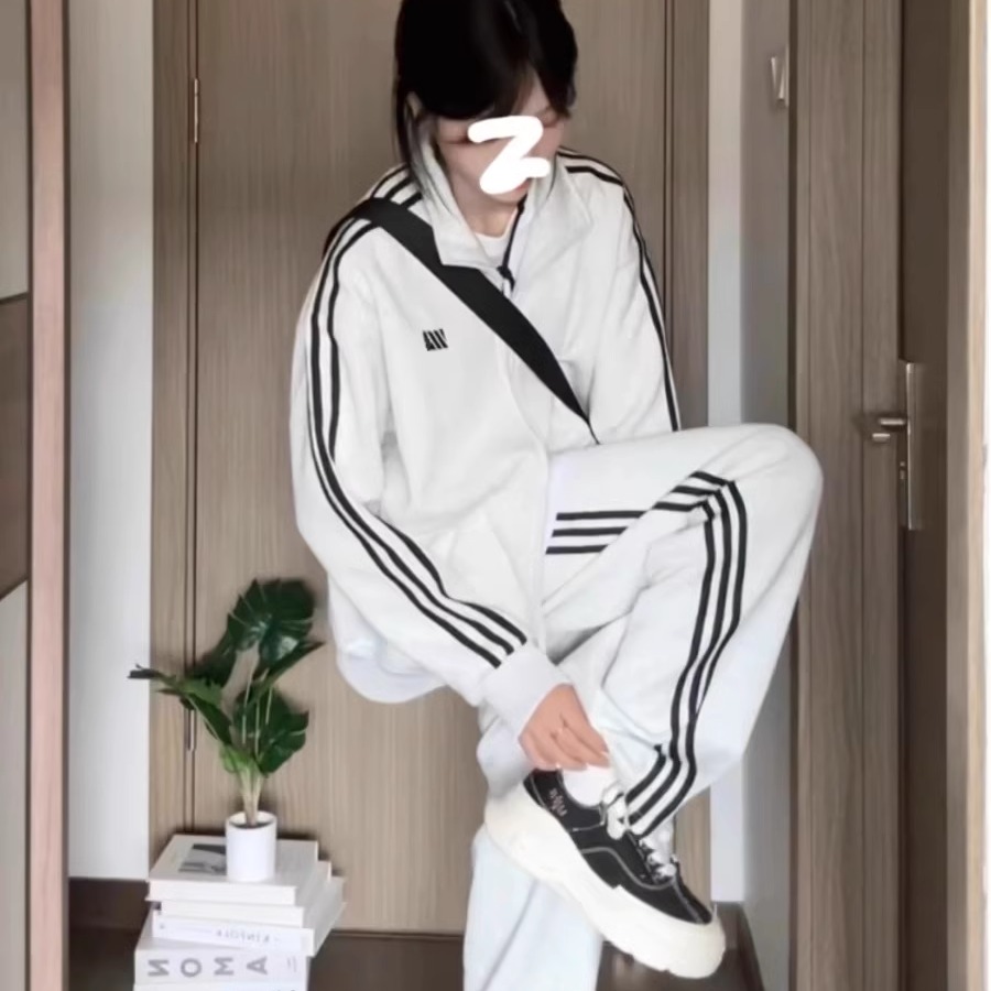 美式休闲运动套装女春秋学生宽松街头三杠条纹立领卫衣长裤两件套
