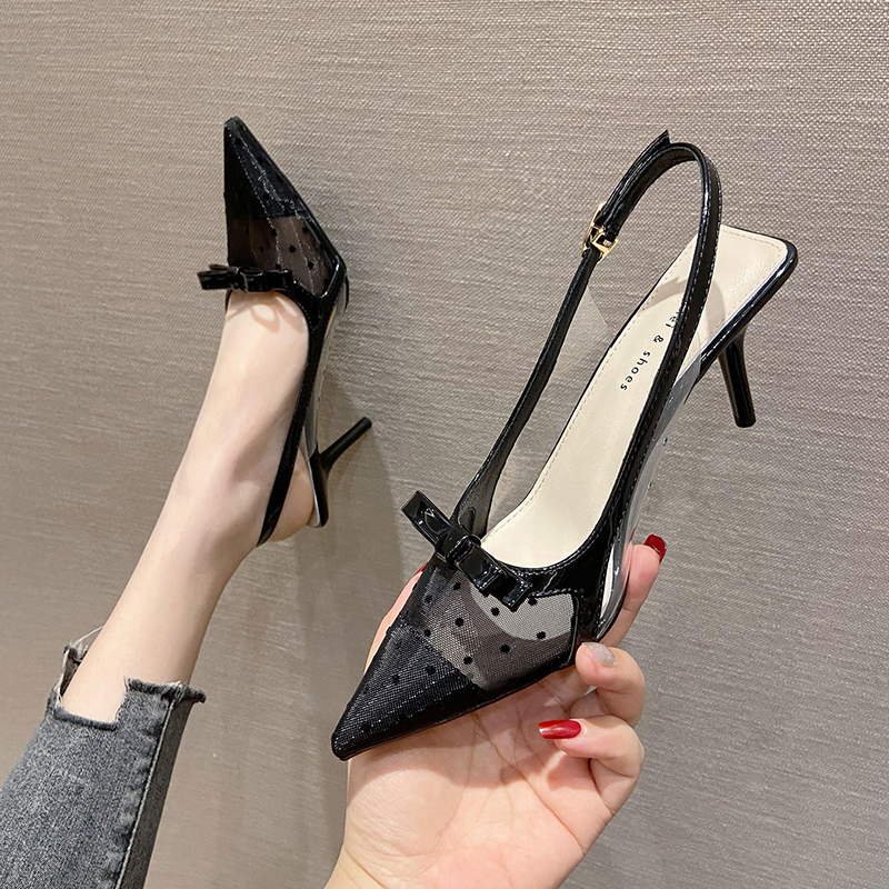 透气凉鞋2025年新款波点网纱高跟鞋女细跟蝴蝶结中跟后空尖头单鞋