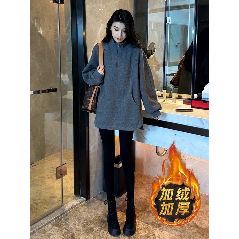 加绒洋气宽松立领长袖卫衣女2024冬季新款中长款休闲加厚上衣韩版