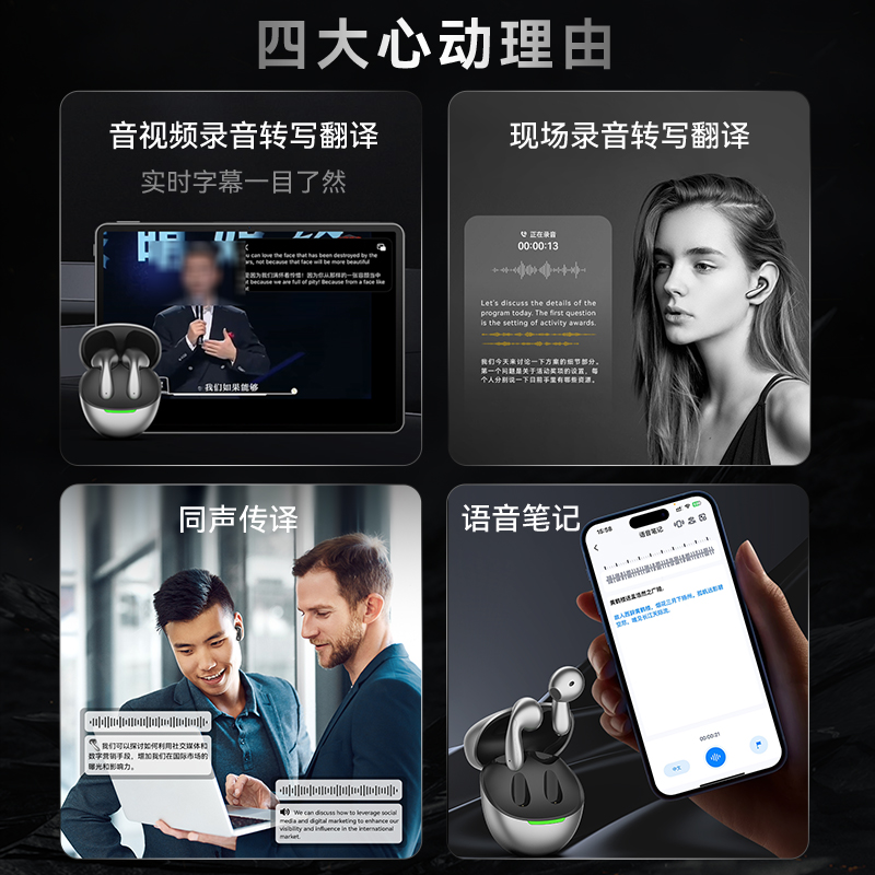 浩设计Ai智能实时同声翻译蓝牙耳机录音商务会议转写学习外语