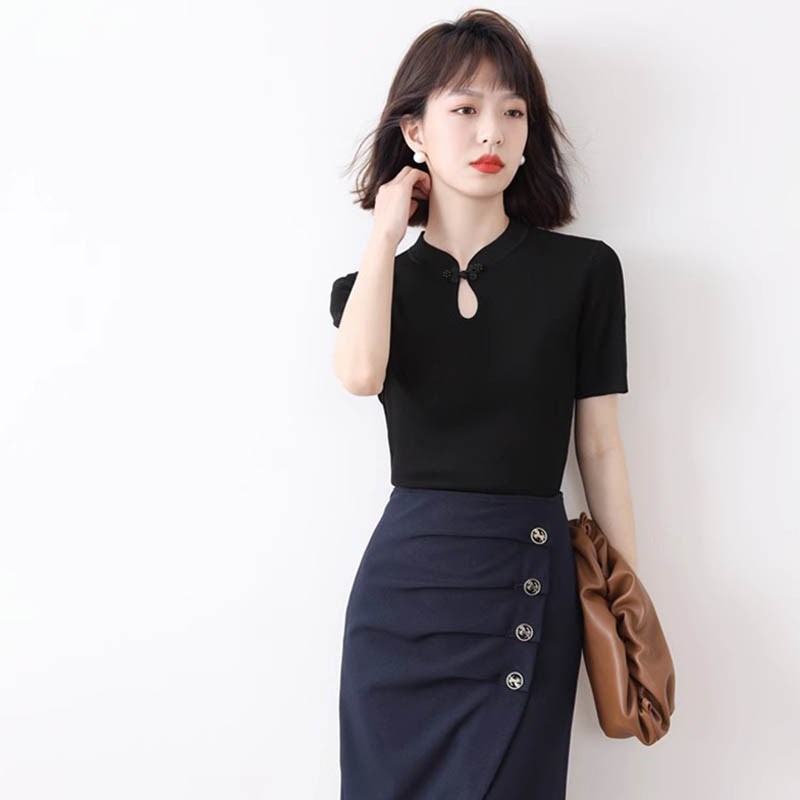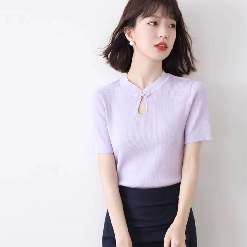 紫色盘扣气质旗袍短袖t恤女2024夏季新款修身显瘦打底针织衫上衣