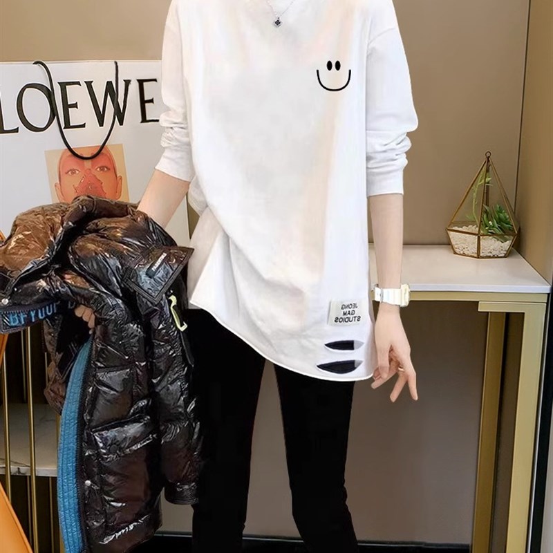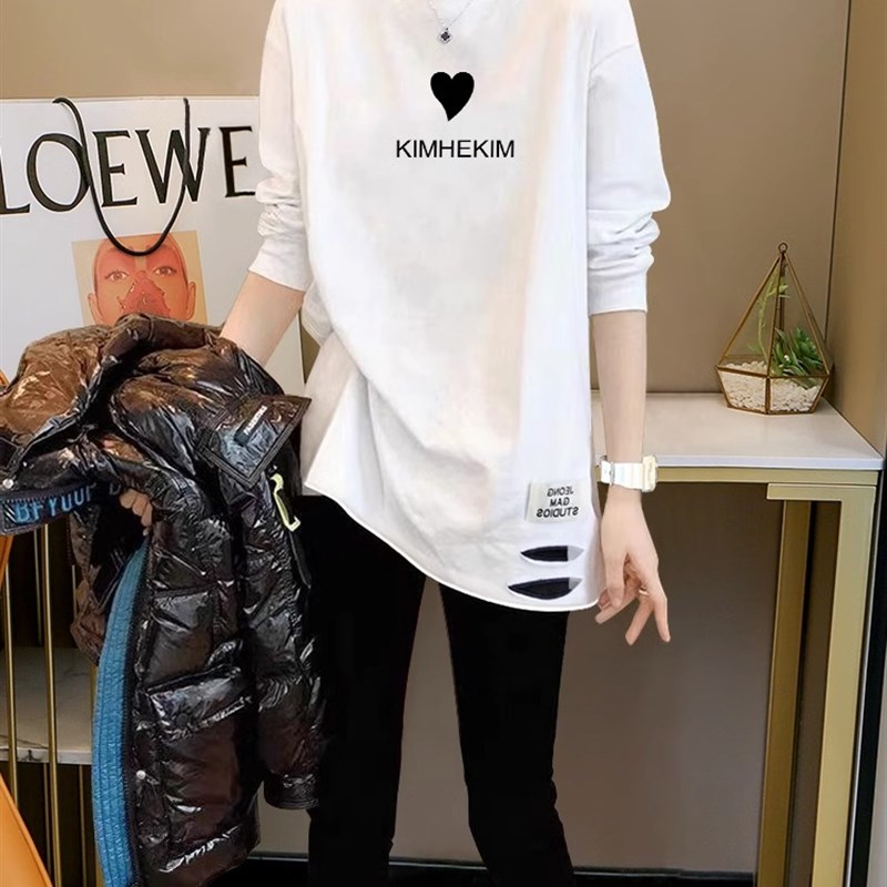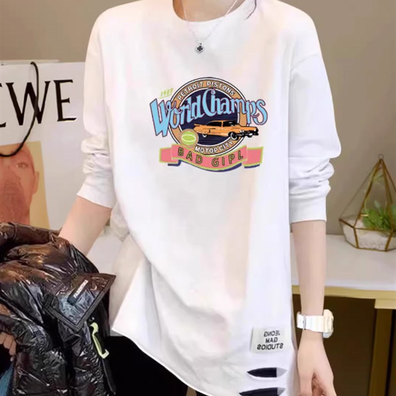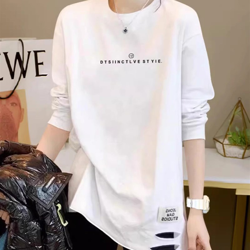 白色破洞打底衫女装2024春装新款磨毛宽松内搭中长款纯棉长袖上衣