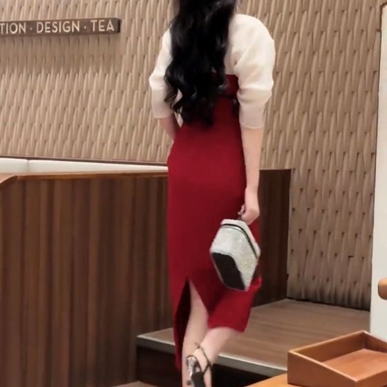 法式泡泡袖拼接显瘦红色中长裙