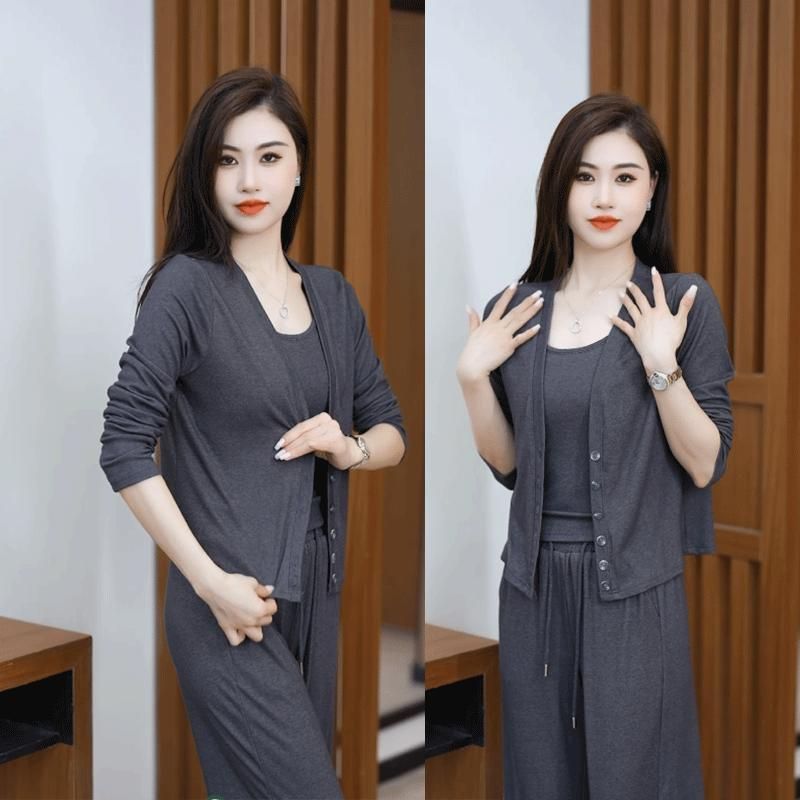 慵懒风时尚休闲套装女秋季新款洋气显瘦开衫背心阔腿裤减龄三件套