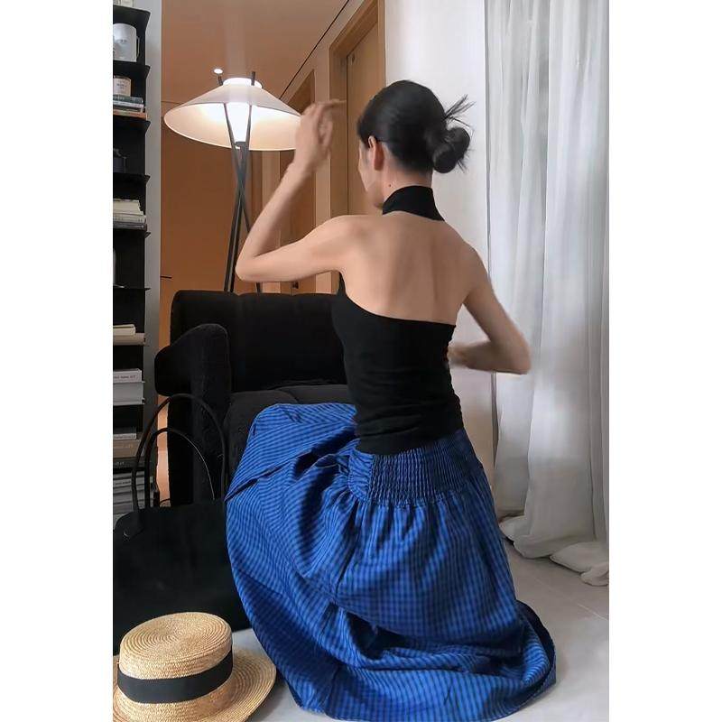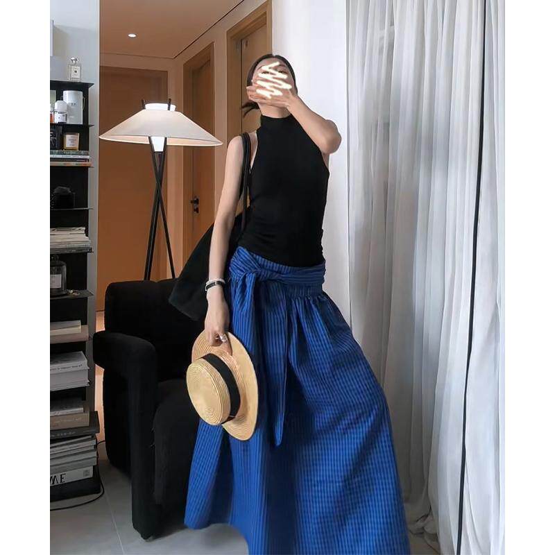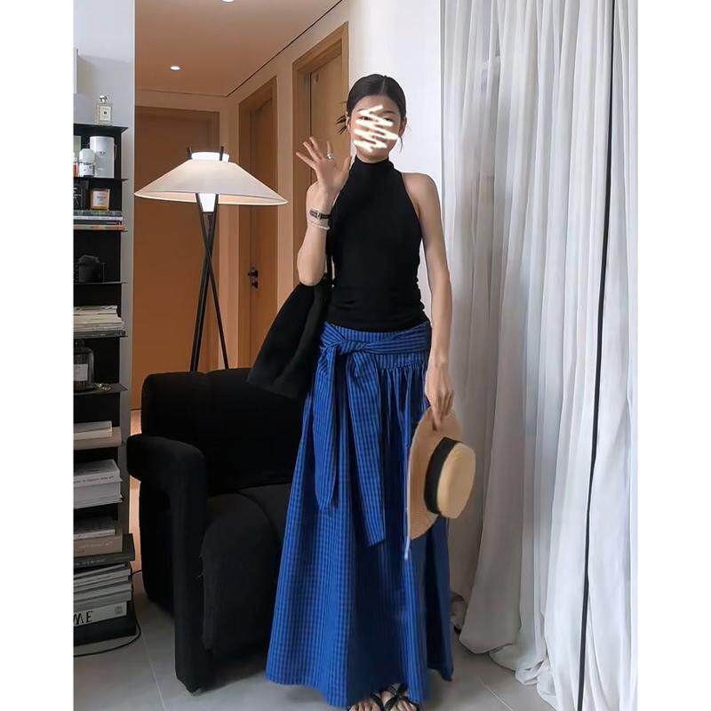 2025春夏新款女韩系穿搭无袖修身背心上衣高腰显瘦格纹绑带半身裙