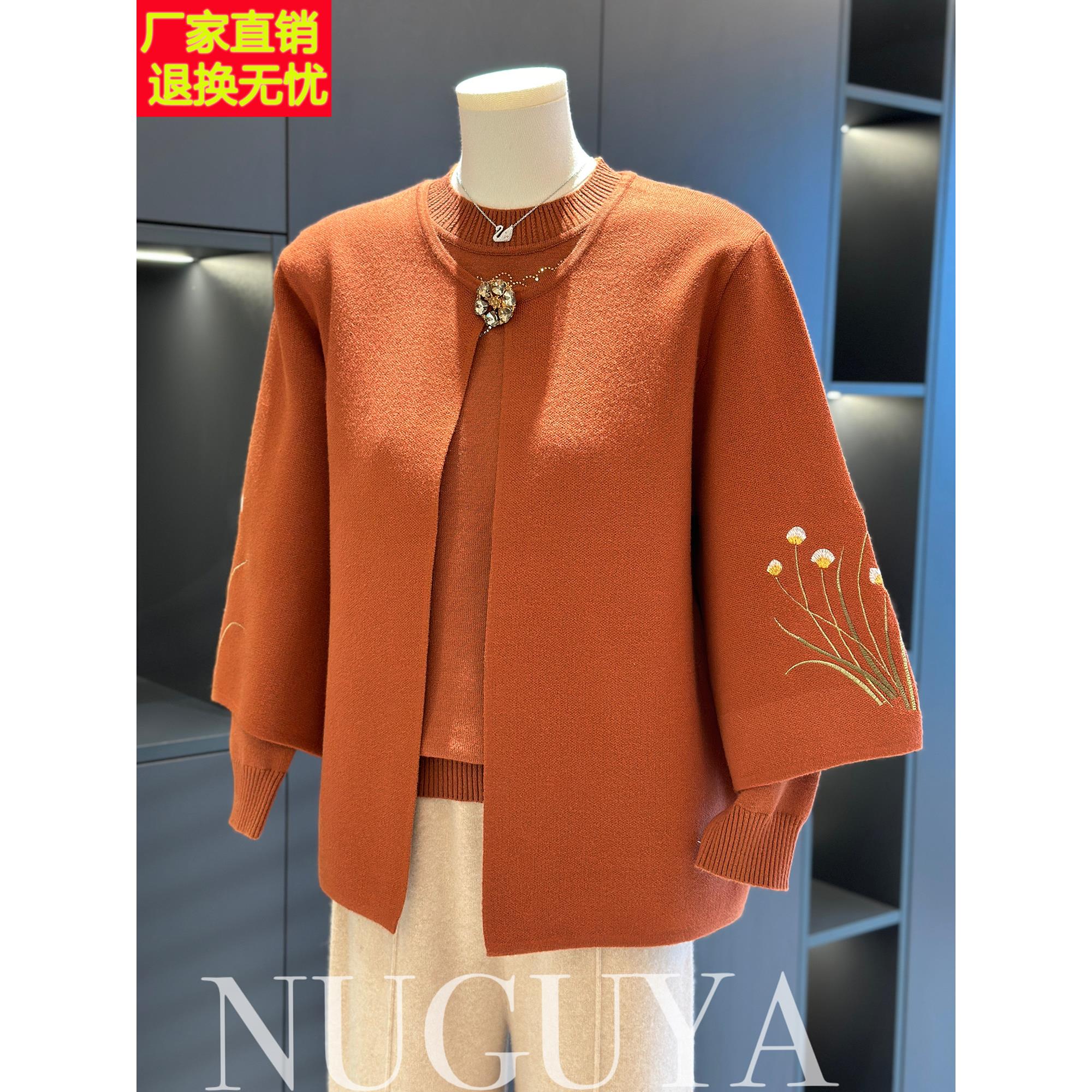 时尚中老年针织衫两件套女2025春秋新款上衣刺绣洋气妈妈装两件套