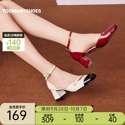 Toomanyshoes女鞋蜜桃茶复古优雅一字带玛丽珍红色粗高跟包头凉鞋