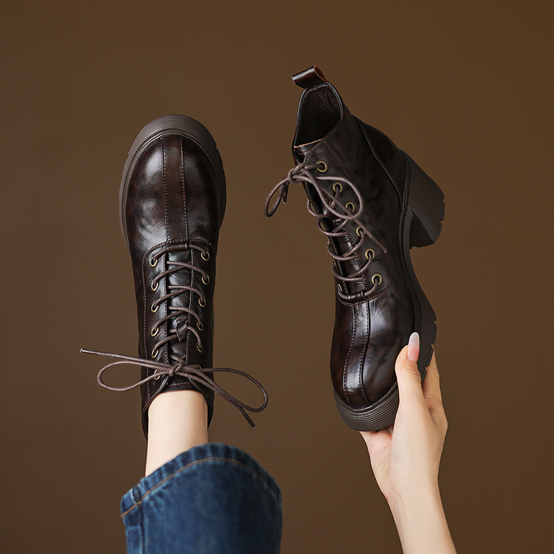 6cm厚底马丁靴女真皮圆头系带粗跟短靴秋冬新款时尚百搭高跟靴子