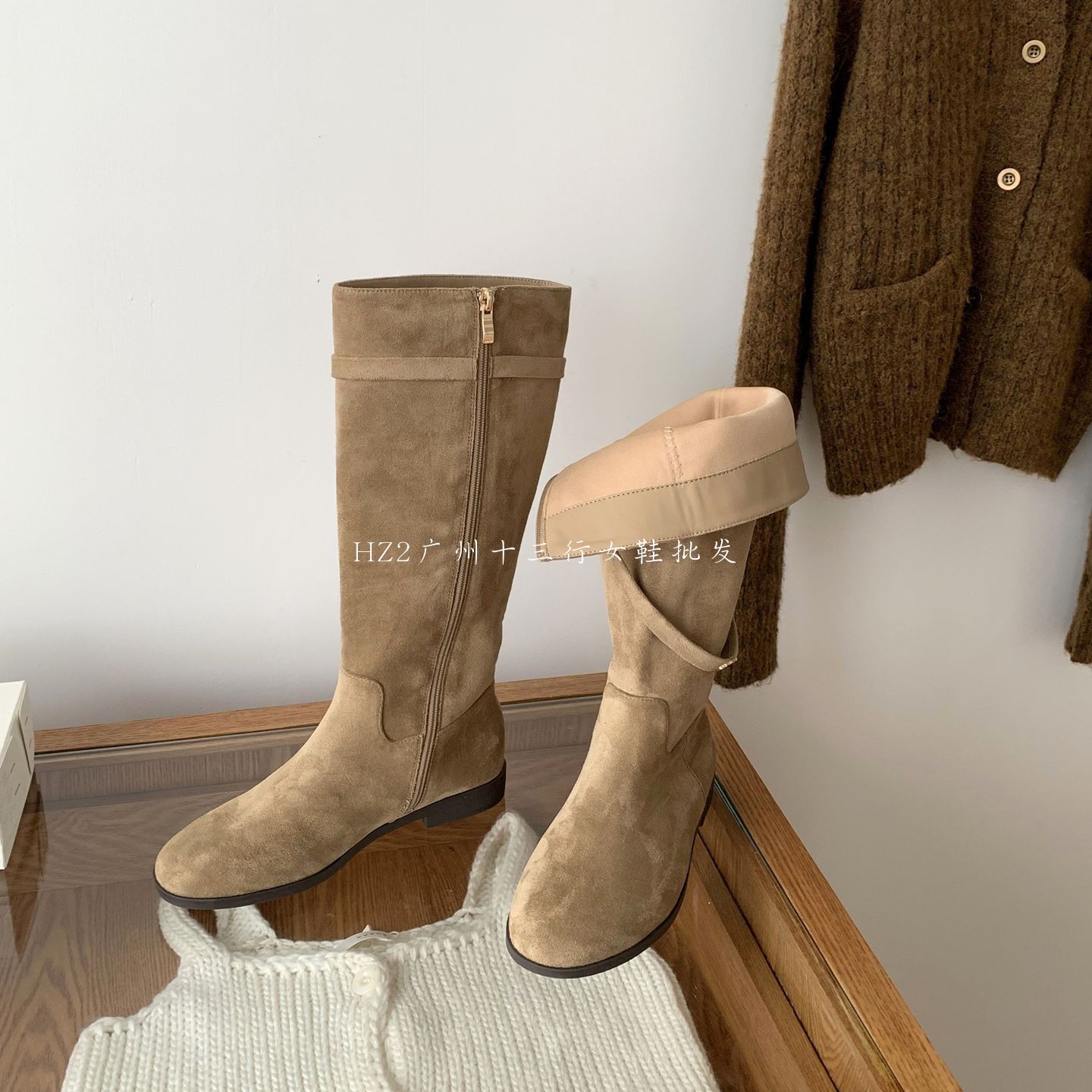 HZ2实拍复古绒面长筒靴女2025新款平底高筒不过膝骑士靴宽筒靴子