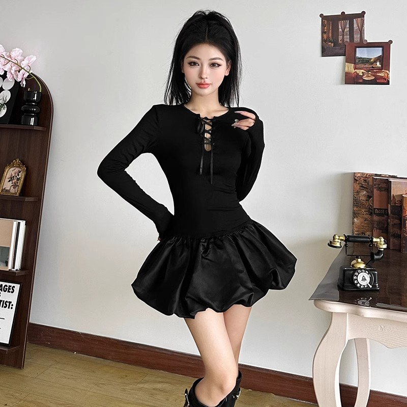 辣妹风镂空系带设计感内搭连衣裙女早春收腰显瘦蓬蓬花苞裙小黑裙