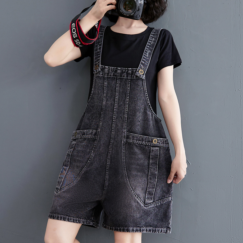 牛仔背带短裤女夏2024新款韩版学生减龄吊带连体裤宽松阔腿五分裤