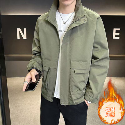 2025秋冬季新款加绒男士夹克帅气立领风衣外套潮流工装休闲上衣男