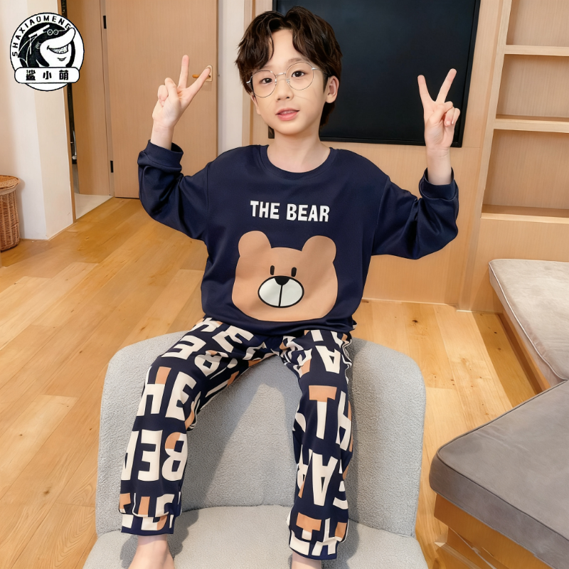儿童睡衣男童长袖春秋薄款纯棉套装小熊男孩中大童宝宝家居服