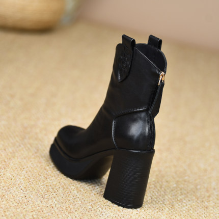misili方头粗跟短靴10.2cm高跟鞋2025秋冬新款加绒厚底真皮女靴子
