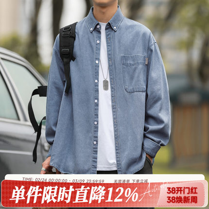 嘿马七作日系复古春秋款贴袋翻领牛仔衬衫男生蓝色长袖衬衣外套潮