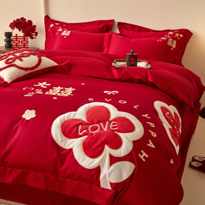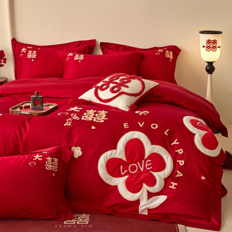 中式结婚四件套喜庆大红色刺绣被套床单陪嫁婚庆床上用品
