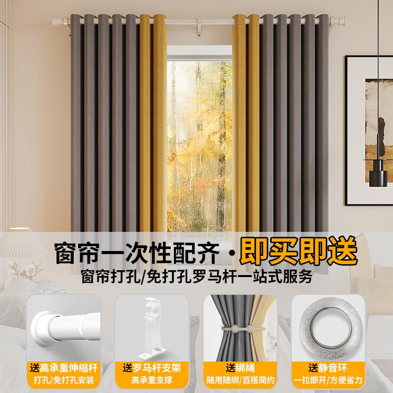 全遮光窗帘免打孔安装带罗马杆一整套2025新款卧室飘窗遮阳防晒布