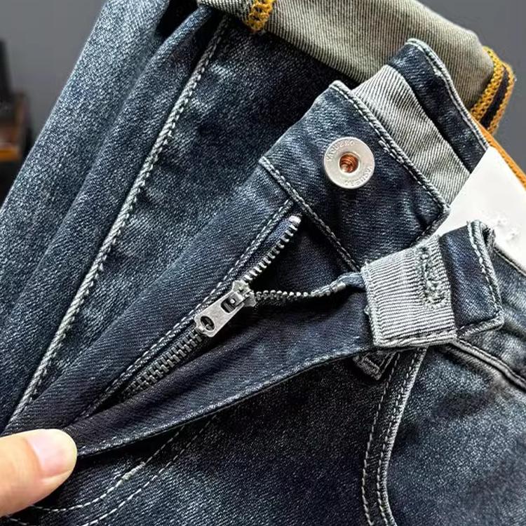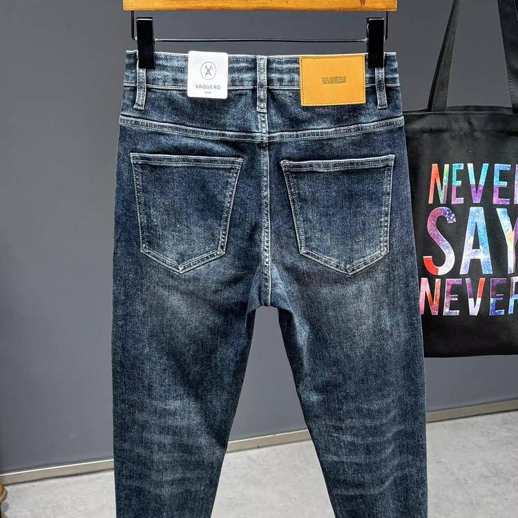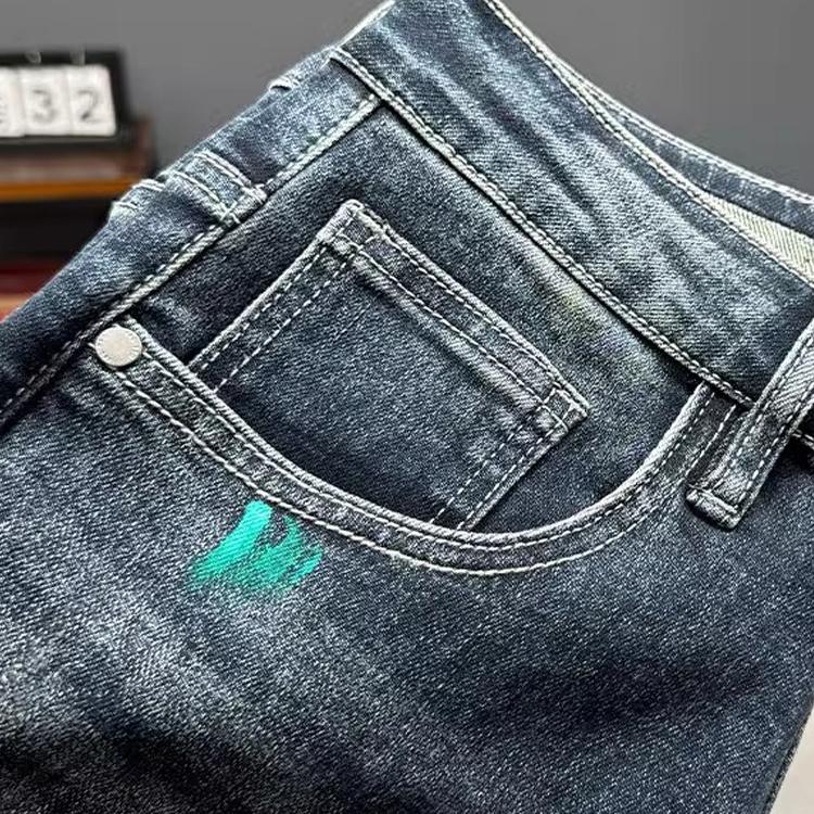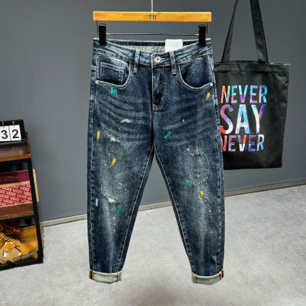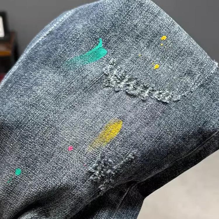 轻奢泼墨补丁牛仔裤男秋季新款潮牌痞帅破洞弹力休闲修身小脚裤子