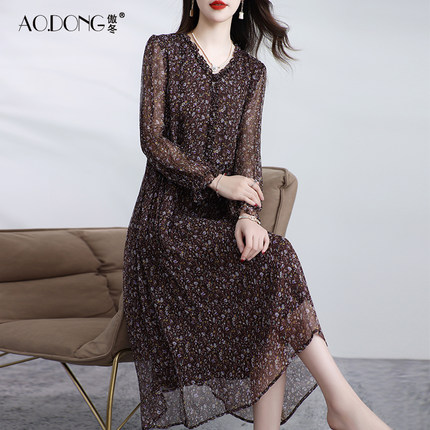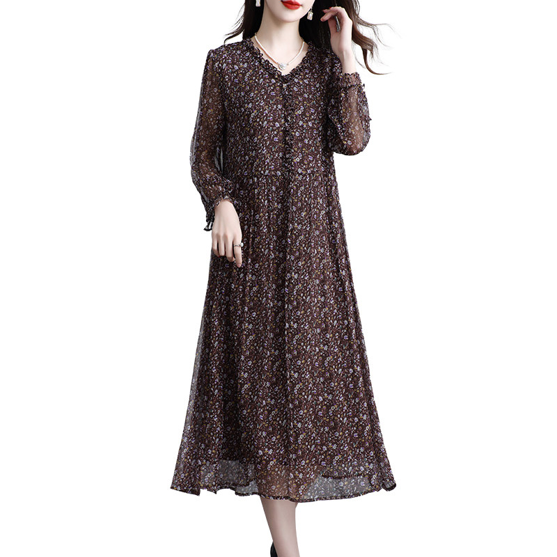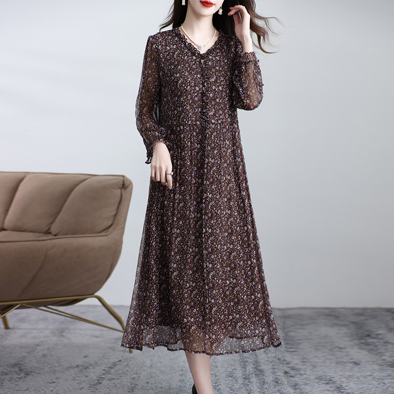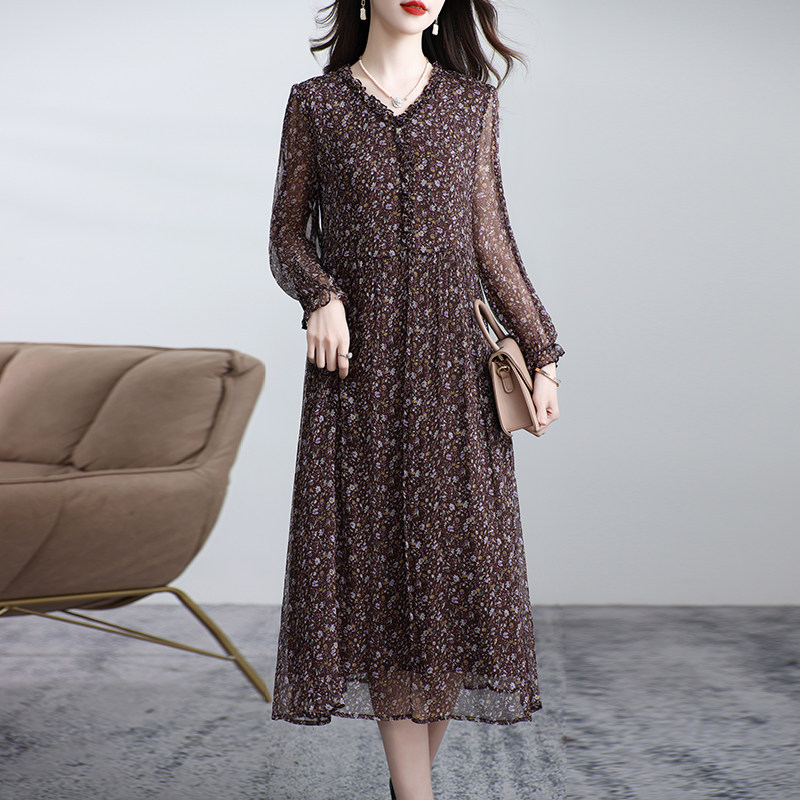 新款真丝连衣裙女长袖桑蚕丝妈妈V领温柔碎花显瘦裙子气质夏季