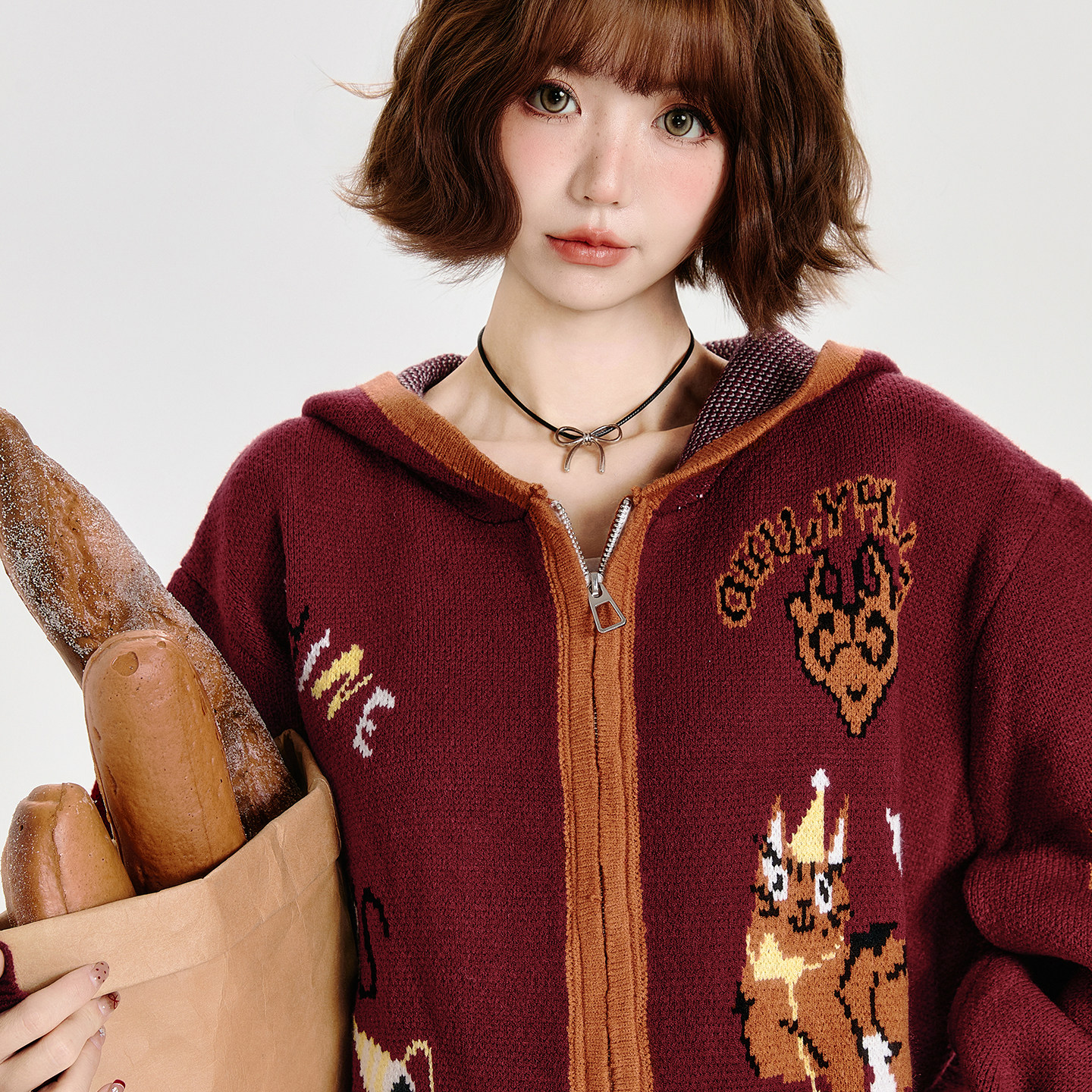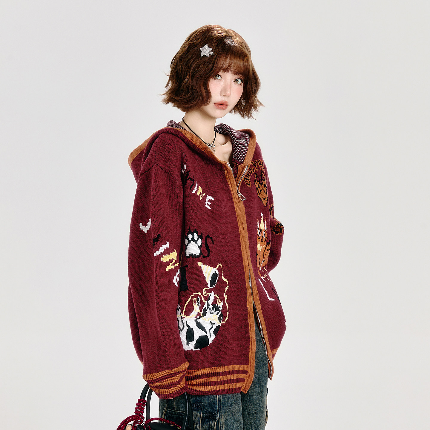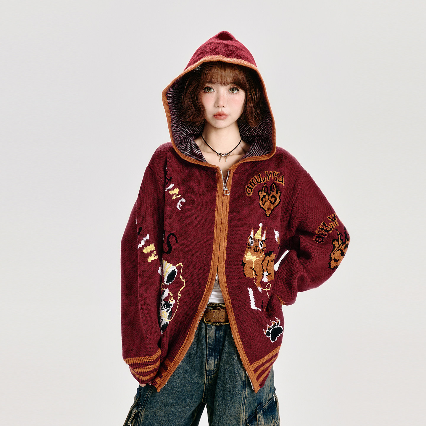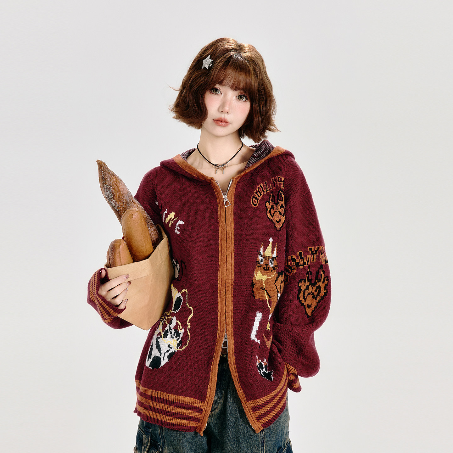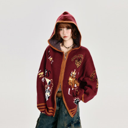 Girlyhalo美式复古动物提花毛衣外套女秋冬新款宽松软糯连帽开衫